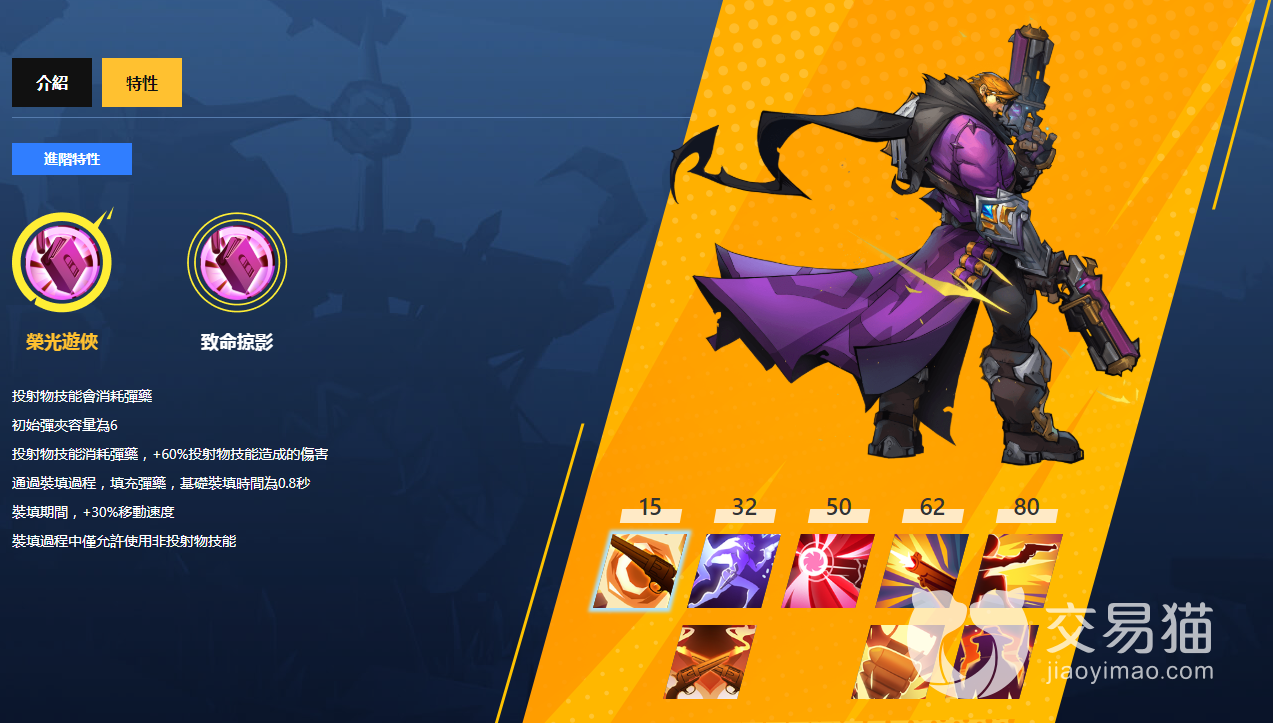 2、角色技能:機動裝填、精準命中、突進射擊、深入死地、銜尾惡蛇、致命間距、過熱槍口、孤注一擲。