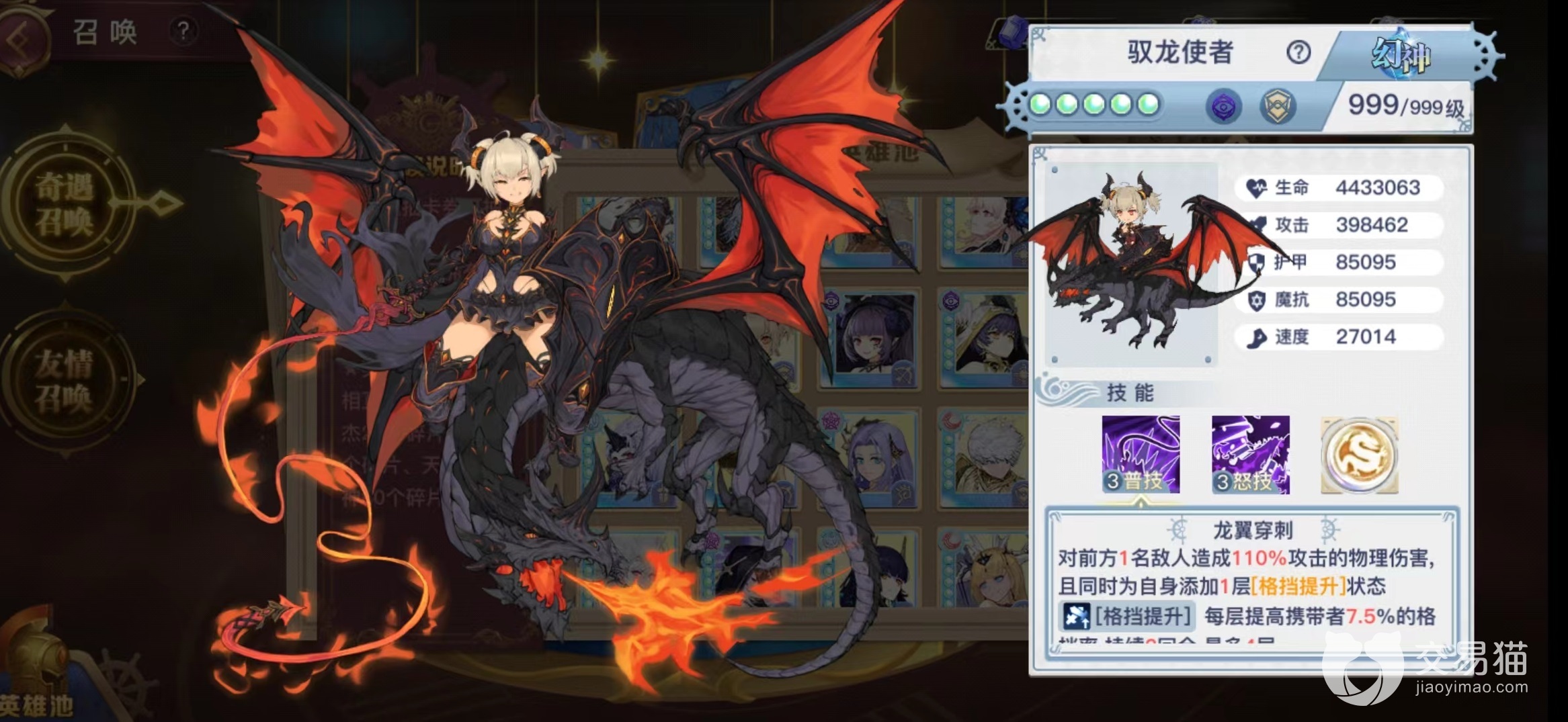 其中驭龙使者属于坦克类型英雄,目前在开荒阶段前排的硬度非常重要,直接关系到后排能否顺利输出。而驭龙使者就是其中非常出色的一位,使用普攻技能后可以为自身添加格挡提升状态,能够叠加最多达到4层。怒气技能魔龙化身,直接回复一次高额血量,并且获得黑龙神甲状态,当携带黑龙神甲后受到的普攻伤害和怒气技能伤害都将降低。激活专属铭文后,在受到攻击时还有几率自身获得巩固状态,提高护甲和魔抗以及提升治疗效果。有他在前排扛住,只需要搭配一个能够治疗的辅助,一套合适的阵容就诞生了。