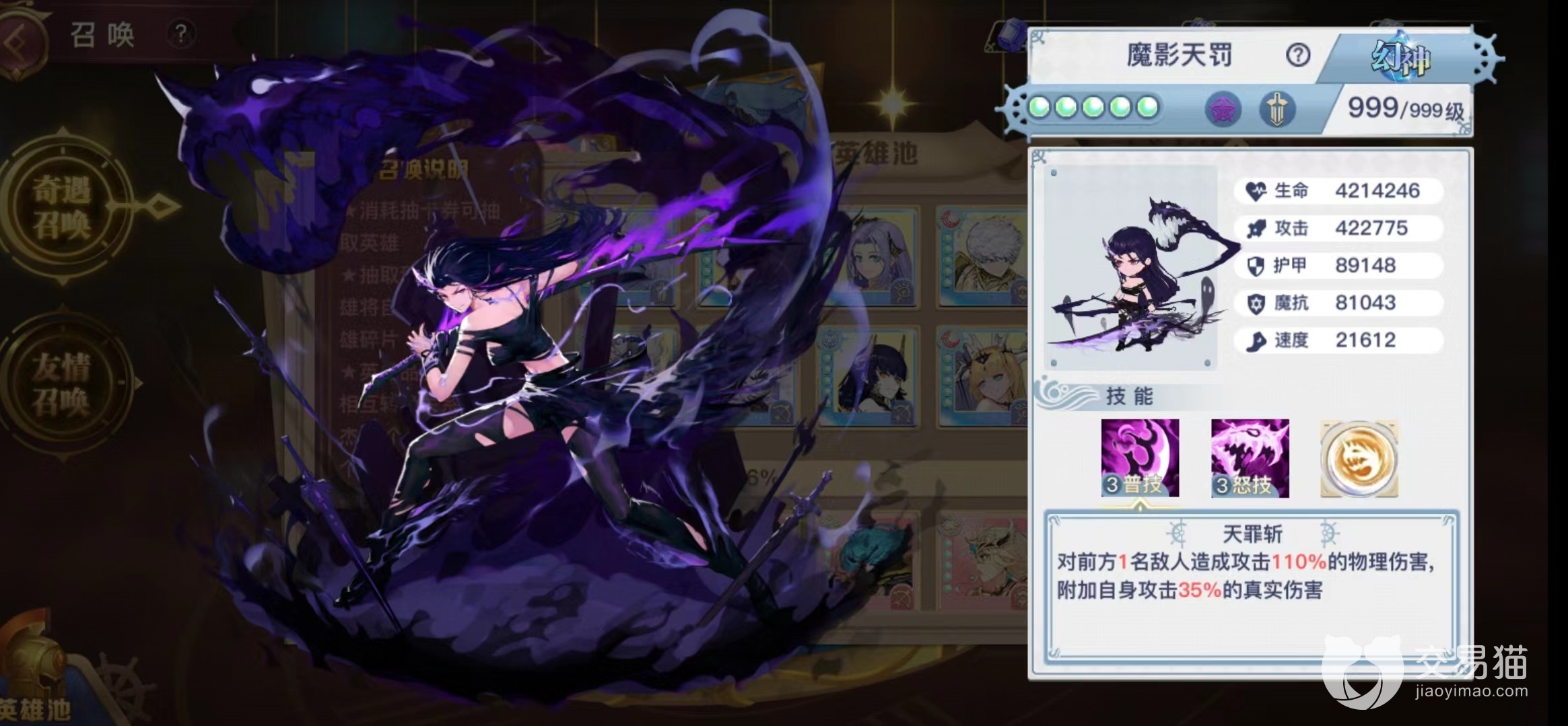 魔影天罚属于战士型输出英雄,普通技能在造成一次伤害后还会追加一次真实伤害,真实伤害无视防御和魔抗,对任何敌人来说都是一次高额的输出。怒气技能炼狱天罚,锁定对方血量最低的三名作为攻击目标,可以造成物理伤害和真实伤害,并且附加魔影缠袭状态,被该状态影响的目标将会无法受到增益状态影响,非常克制一些以增益吃饭的阵容。在激活专属铭文后,每次敌方有阵亡目标,魔影天罚都能恢复一次血量,并且自身获得魔神状态。提高攻击力和伤害减免效果能够持续15回合。这个技能使得其成为一名越战越勇型的角色,叠加起来之后后期输出非常可观,是一个能打能扛的英雄。