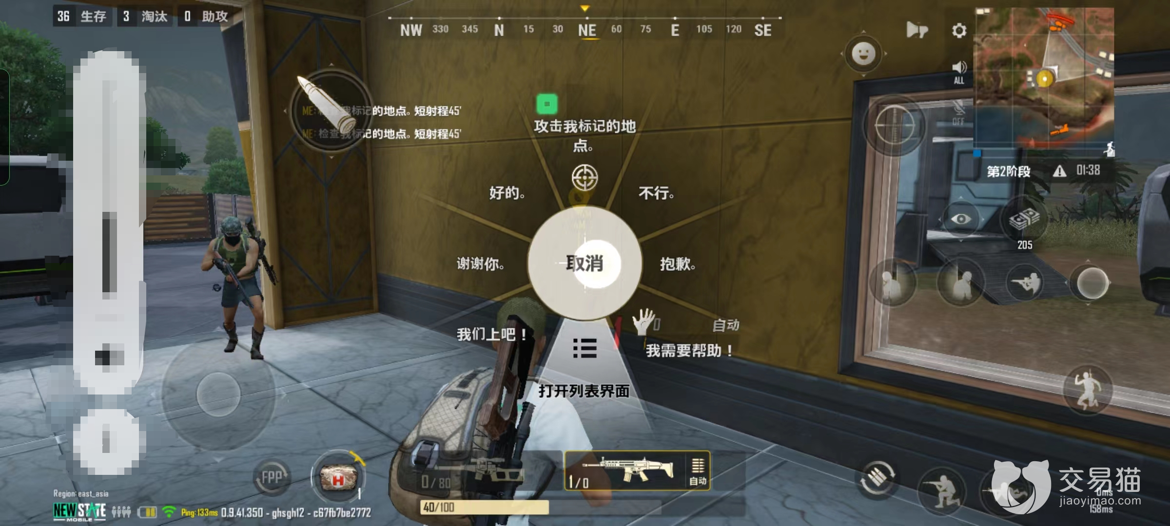 进入游戏后想要进行打字沟通,需要玩家长按万能键。万能键的默认非常小,位置在最右边的,也就是跳跃的上面,肩射的右边。玩家长按万能键,会启动一个陀螺仪。该陀螺仪就是为玩家传递信息所设计的,玩家滑动陀螺仪可发送一些快捷消息,比如攻击我标记的地点、不行等等。