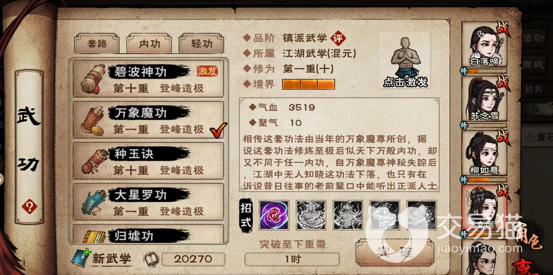 化蛹:不消耗内力值,该技能是回复技,每回合气血可以回复一定数值。