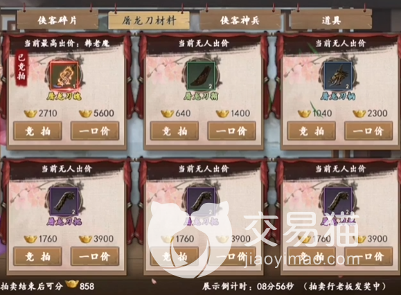 所有这些材料中,刀魄和刀尖的价格都是最高的,因为涉及到升20星,所以起拍价都需要两千多元宝。而目前屠龙刀的最高星级也就是20星。剩下的一些材料起拍价都会稍微低一些,最便宜的只要几百元宝,如果不小心买多了材料玩家们也可以低价卖出去来稍微回本。