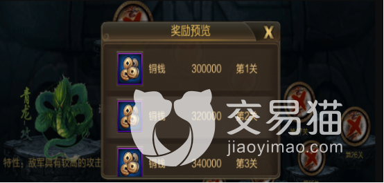 前四个关卡的第一关是青龙,这个关卡比较简单,使用中规中矩的阵容搭配就可以了,使用诸葛亮为主的阵容,搭配马云禄、小乔这样的武将,就可以顺利通关了,并且自己的兵将损耗也不会很大,只要保住诸葛亮,一般情况下就是没有问题的。通关后会有铜钱奖励,并且每一小关通关后递增2万,奖励还是比较丰厚的。