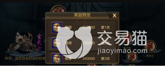 第三关是白虎关卡,这一关的关卡奖励是在游戏中十分重要的道具-兵符,而且递增的数量也比较少,每五关才递增一个,可见这个道具是比较珍贵的,第四关的通关奖励为粮草,没通一小关的奖励是递增2万,和青龙关的铜钱奖励数量是一样的,这两个关卡的阵容可以使用以张昭和鲁肃为主打的阵容,加上控制型武将,基本上就可以通关了。