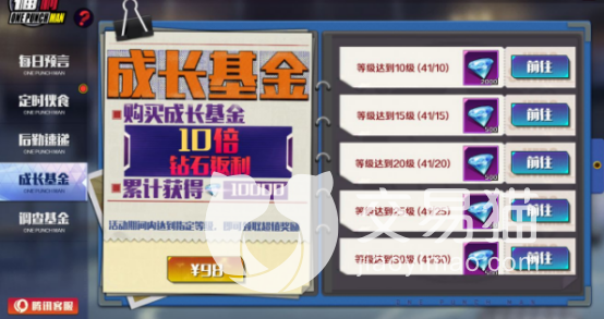 3.成长基金。新人账号氪金98元就可以获得一万钻石的奖励,钻石在前期十分的重要。不仅角色的升级需要钻石,商店中的各类重要道具也需要通过钻石来购买。