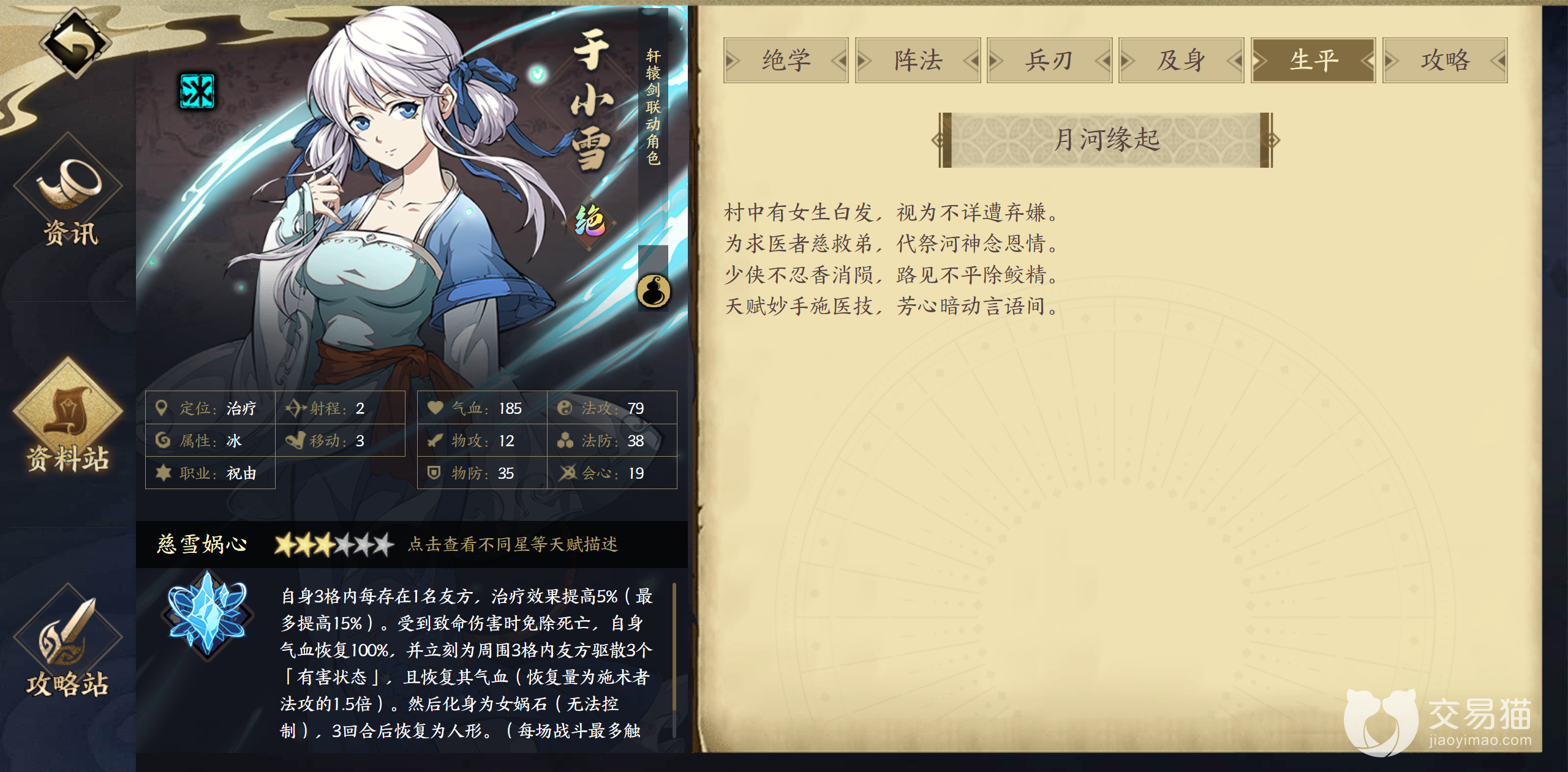 5、于小雪:冰属性奶妈,这是唯一一个可以与风玲笙作对比的奶妈,因为其特殊的技能面板和大型抬血让很多玩家在开荒的时候都会选择她,她的技能有主动被动两种形态,可以奶可以输出,在单纯的奶妈效果之外还可以给队友加防御和攻击等多种增益效果,治疗量不仅大而且冷却时间非常的短,可以频繁抬血保证队伍的血量,而且在抬血的时候更是可以无视距离。