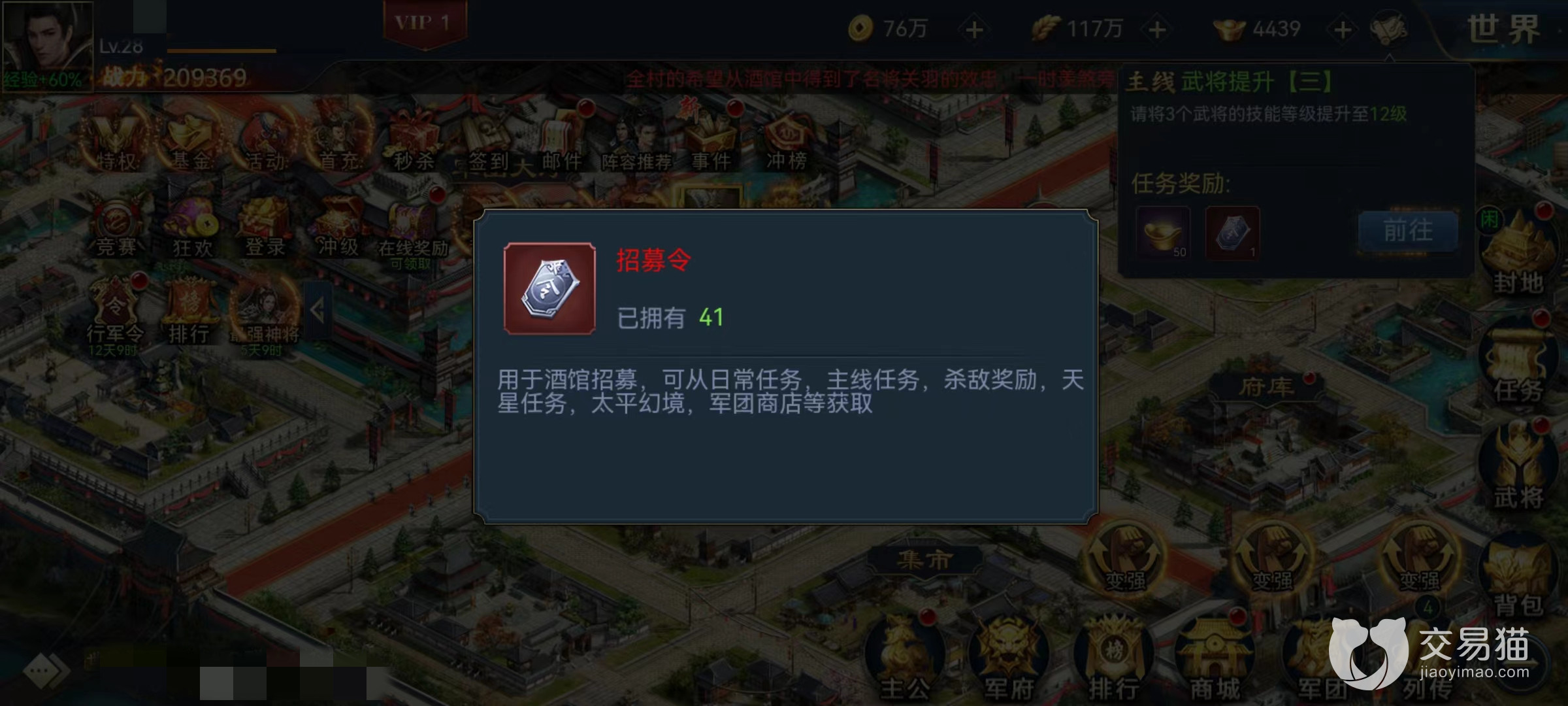 目前来说获得招募令最简单的就是通过主线任务,在进入游戏后,界面的右上方会出现主线任务提示,只要按照要求去操作就可以了,主要任务类型是让大家通关指定列传,或者是武将等级达到指定数值,以及其他一些游戏中正常出现的内容,按部就班的去做就可以获得不少招募令。
