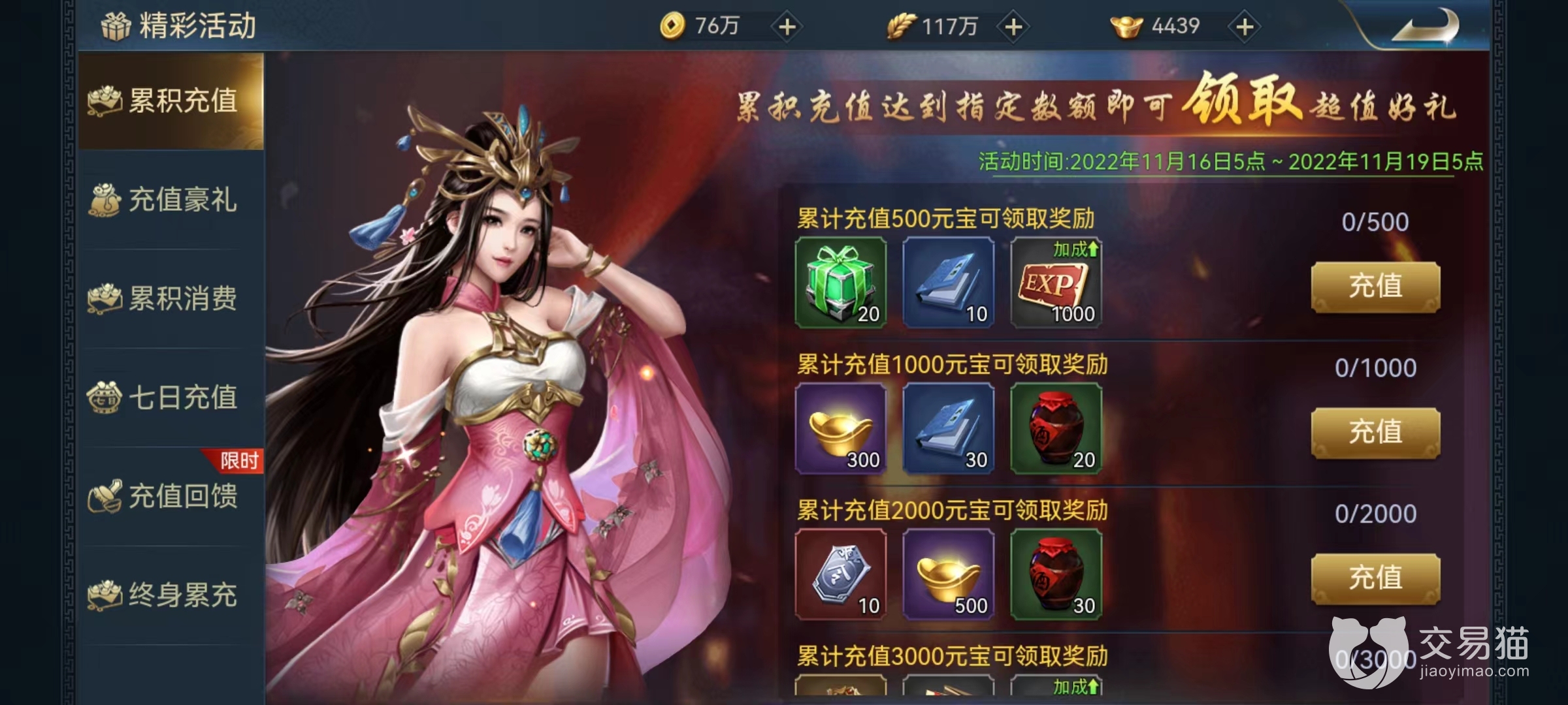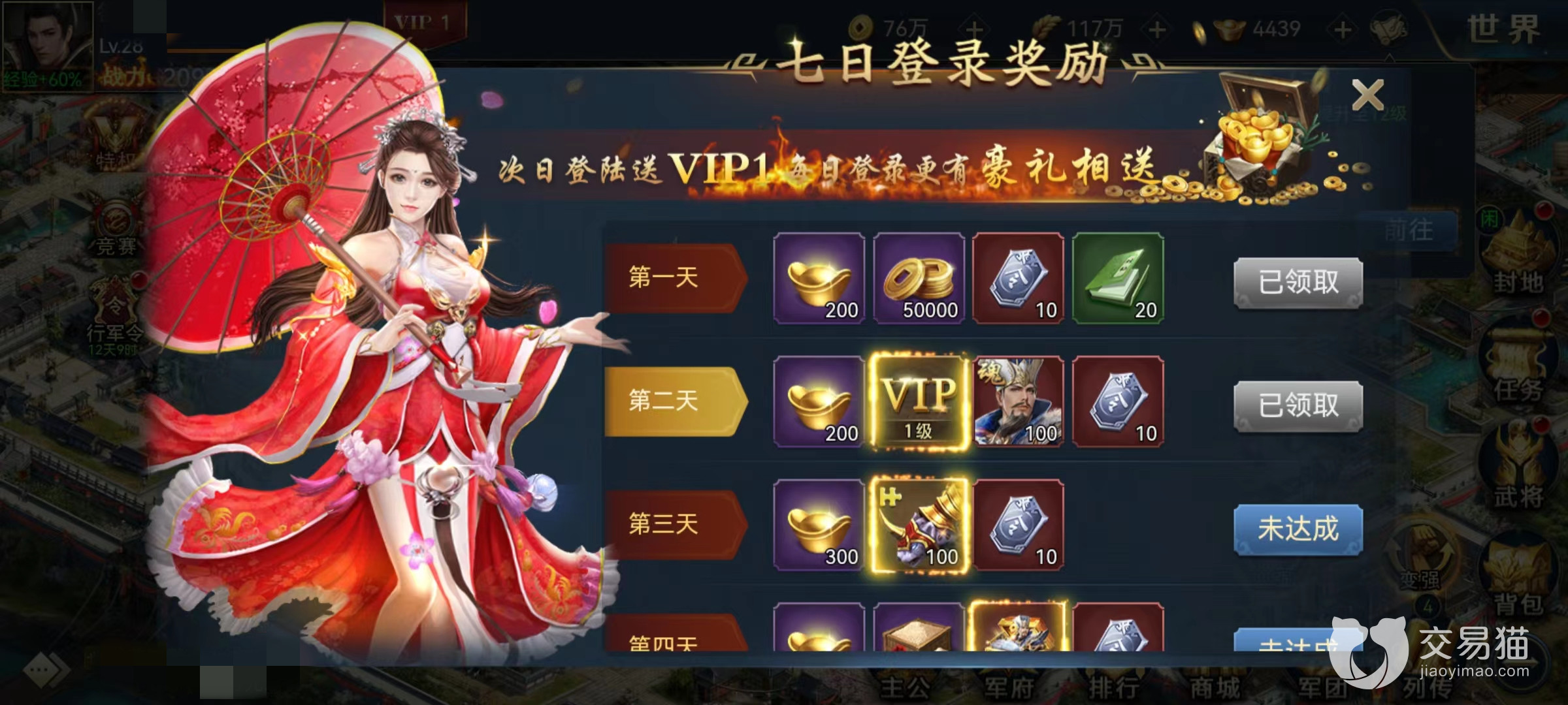 7天登录则更加简单,不需要做任何活动,只要每天登录一下游戏就能领取,奖励除了元宝金币招募令等之外,还会赠送VIP等级,帮助大家体验充值的乐趣。主线任务奖励需要大家按照任务需求去完成各项活动,能够奖励元宝和招募令,无需刻意去做,只要按部就班的在游戏中操作就可以了,需要大家多投入一些时间。开服狂欢指的是为玩家设定了一系列目标,每天都会有不同的任务,只要能够达到这一目标就可以获得相应奖励。