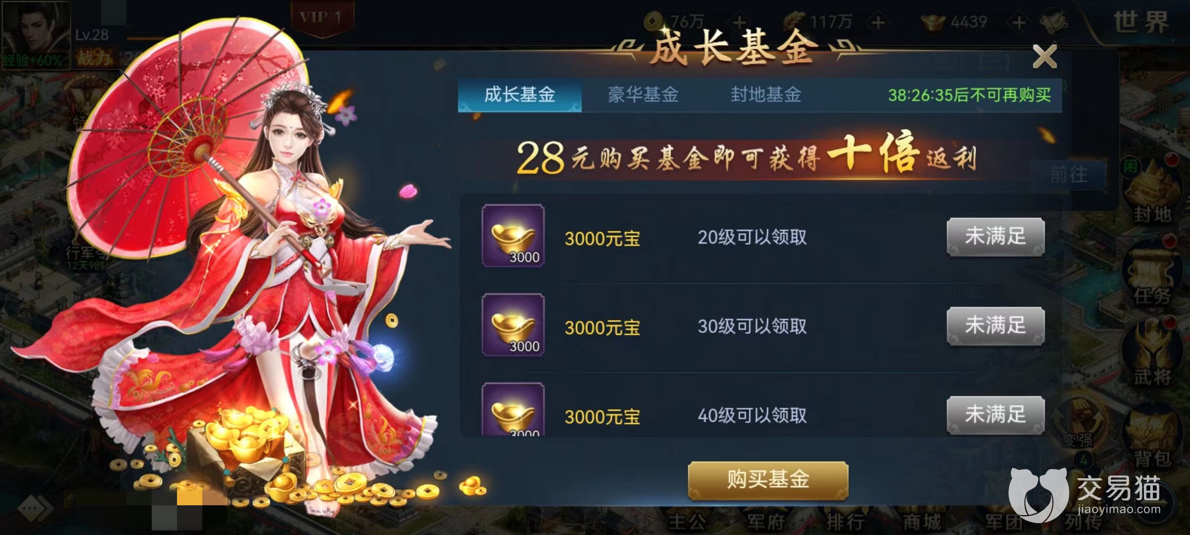 接下来还有需要少量充值才能获取的福利,最重要的就是特权卡和开服成长基金。特权卡建议大家开启一个无限招募卡,这样每天都能领取招募令以及获得特权。开服基金只要投入少量元宝,此后每达到指定等级都能获得额外元宝赠送,最终将获得几十倍的收益,对于弥补元宝不足非常关键。最后是开服首冲直接赠送神将吕布以及大量道具,帮助大家快速形成阵容。