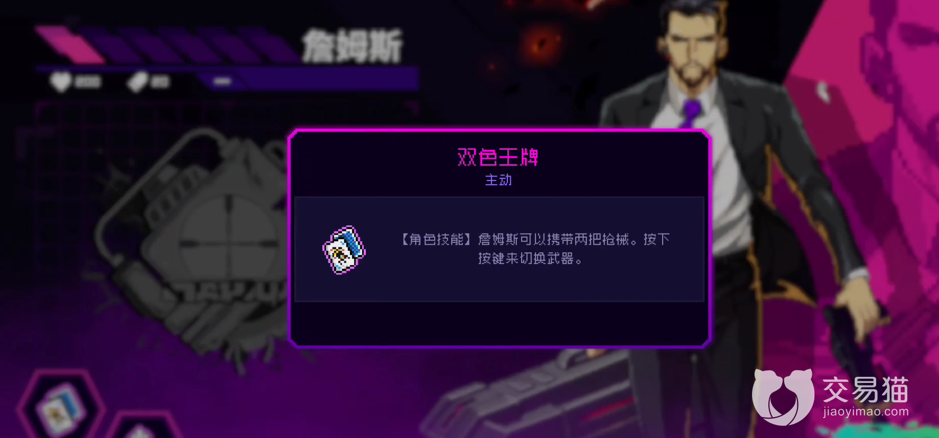 首先要给大家介绍的就是该名角色的主动技能,双色王牌。这个技能可以使得该角色可以携带两把枪,比一般的角色多使用一把武器。这可以让该角色获得更好的游戏体验和战斗力,毕竟多一把武器防身可以获得有更多的打法和游戏容错率。一句话评价就是,顶尖的游戏技能。