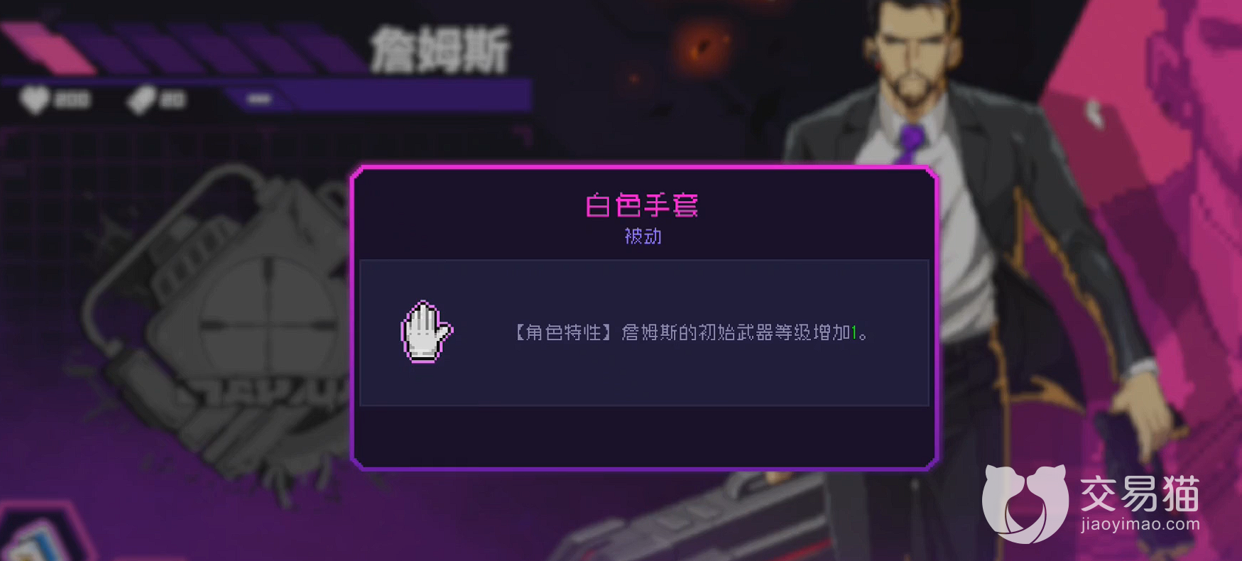 第二个技能就是白色手套可以让初始武器的等级提升。这个技能还可以,不是特别的强。不过加一的武器出发的话可以在初期战斗中获得一定的优势,让角色有足够的发育时间。在前期的武器选择方面都有着较多的选择,可以选一些较为后期的武器。