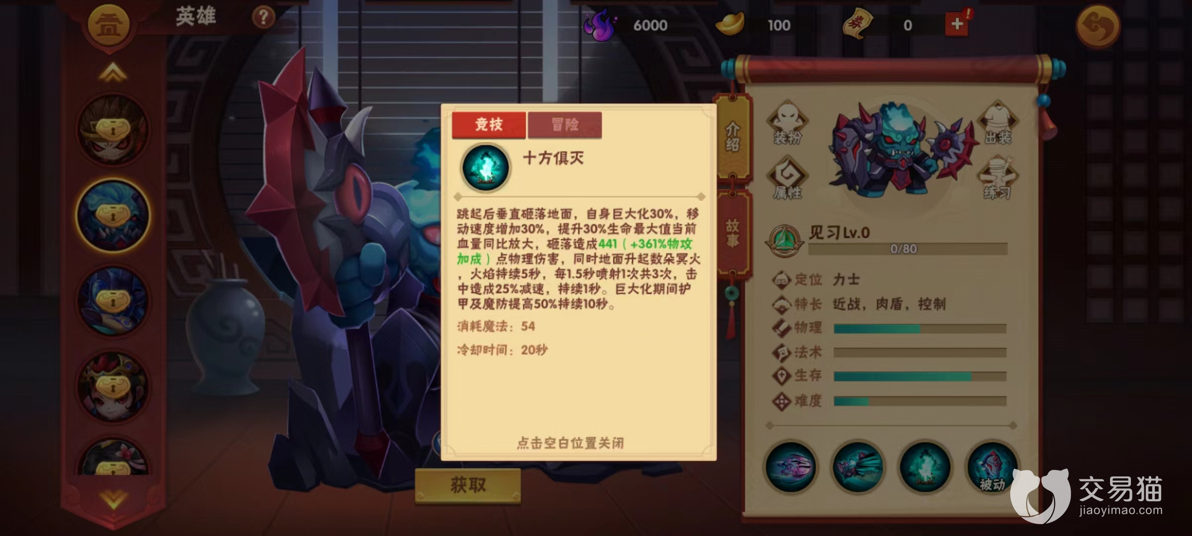 最后一个技能十方俱灭,刑天跳起后向目标地方砸落,落地后自身体积增大移动速度增加,生命值提高。而且在此期间,刑天的护甲和魔抗也相应提升,这是一个坦度非常强的技能,使用起来简单,只要开战之后直接释放就可以了。
