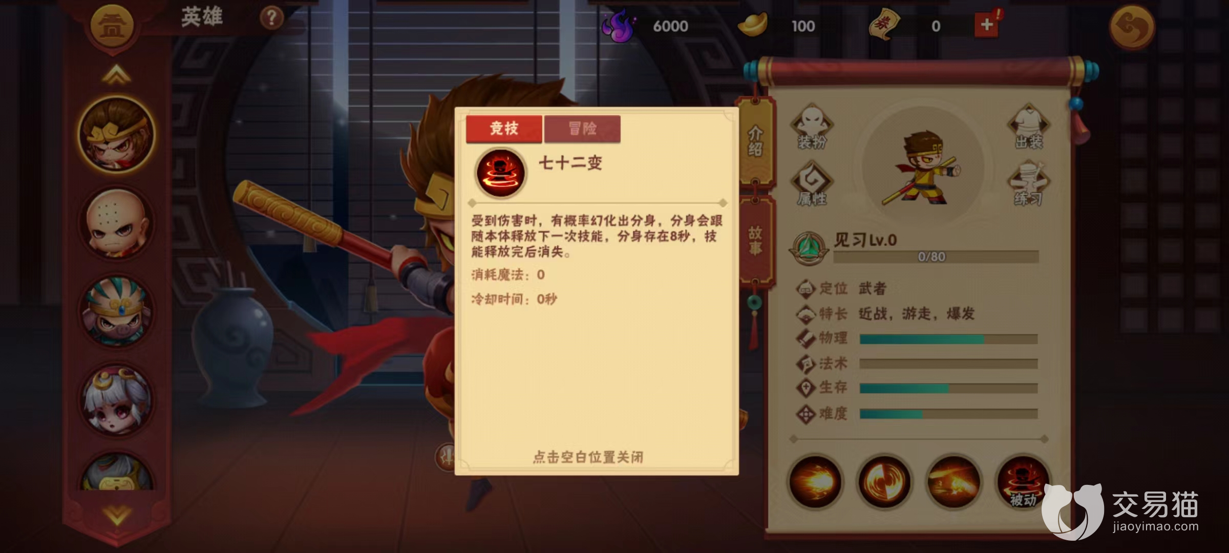 被动技能72变,一旦受到伤害就有几率出现分身,所有的分身和本体都能够一起释放技能,分身存在8秒钟,如果技能释放后会立即消失。分身是孙悟空一向非常重要的效果,让对方无法看清真身与分身,使得该英雄拥有更好的输出空间。