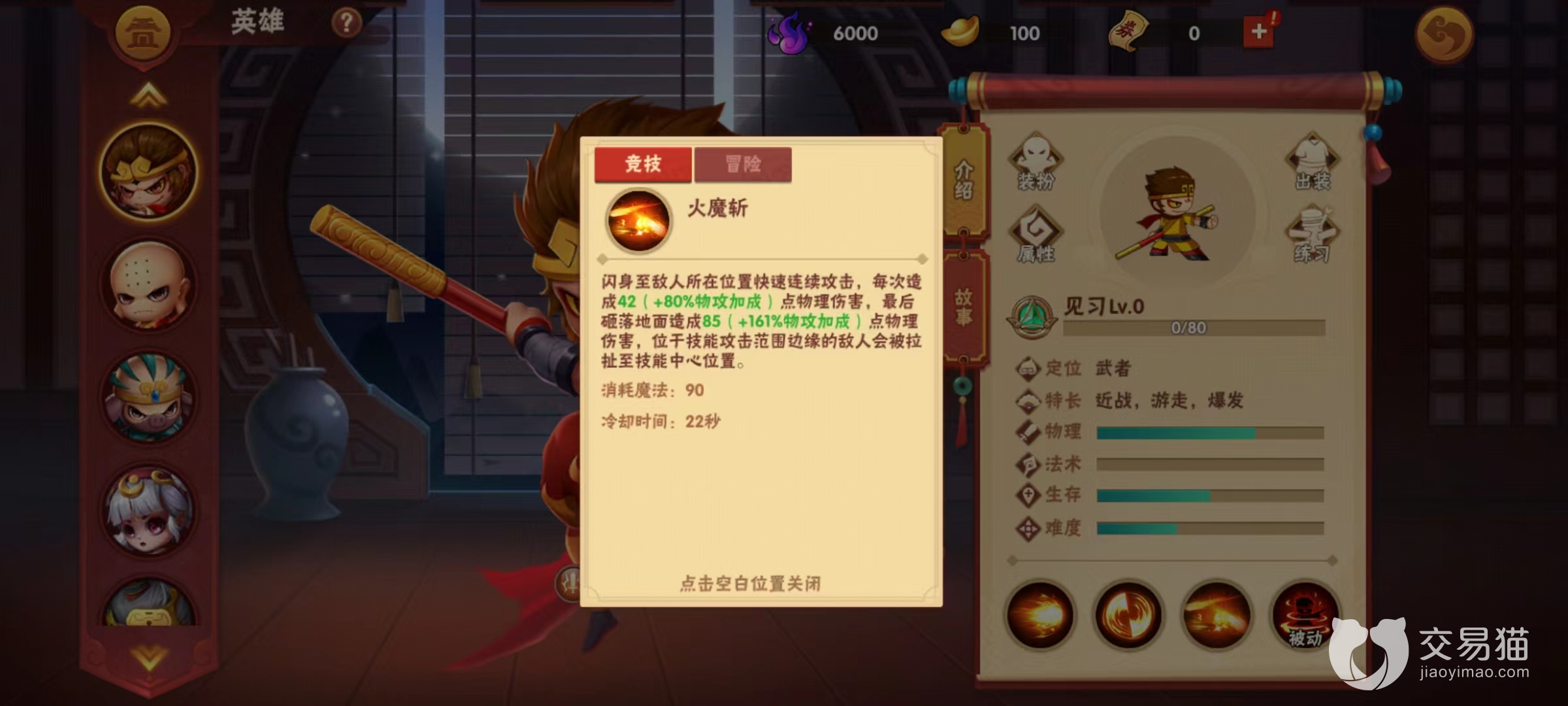 技能旋风斩,将金箍棒快速旋转起来进行攻击,可以将敌人挑飞并且造成物理伤害,适合于近身之后直接开启进行输出,敌方人数越多,则造成的伤害也就越高。大招火魔斩,快速闪现到敌方位置,连续进行多次攻击,总计造成海量物理伤害。连招结束后落到地面再造成一次输出,而且对范围内的敌人拉扯到中间。