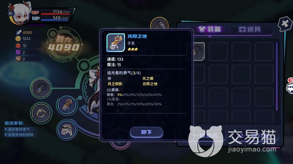 在选择手套的时候,玩家们就需要观察速度属性了,如果速度属性偏低,各位就需要直接放弃。最低标准需要选择一个三星的光陨之地来使用。这一个手套会为角色带来133点速度加成,战斗的时候可以更快比敌人先进行攻击,让大家快速的掌握好输出优势,避免让角色去承受更多的伤害。