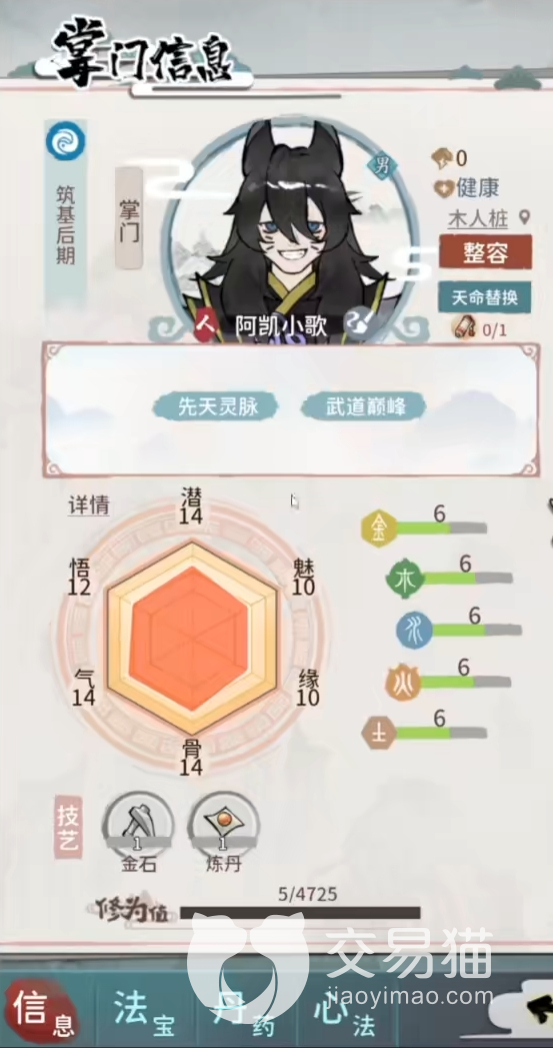 六维属性包括潜力,根骨,气感,魅力,机缘和悟性六种,开局月份可以刷到一枚六维优秀弟子。五行灵根用来提升对应的属性加成,攻击防御减伤等。主局在先天灵脉后期打pvp时会有很大的作用。