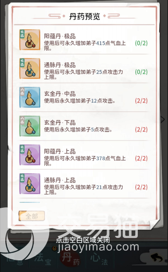 首先在游戏中,我们需要了解一下丹药的种类和作用,它们的作用我们可以非常四大类,练功、气血、防御、攻击,其中的练功就是增加修为的,所以我们要尽可能的去收集齐所有的丹方才行,这些我们的属性才会更加强大。