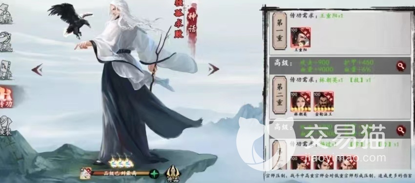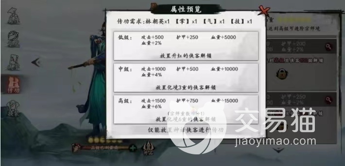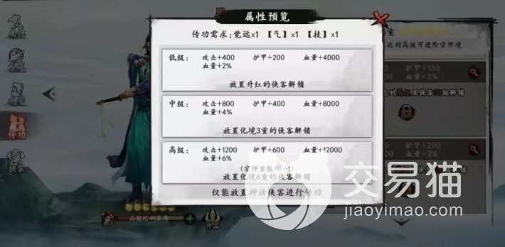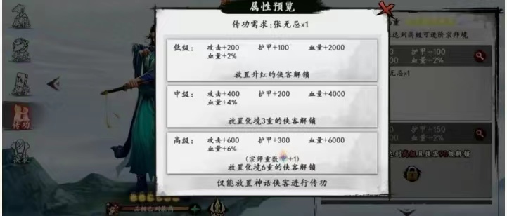 而且放入传功的角色也是有讲究的,需要达到神话品阶且化境以上才可以。虽然不会令放入的角色出现消失之类的,但关是神话可能就令玩家头疼了。不过也不要担心,玩家呢可以根据已有的神话角色来进行传功,所以在配队时玩家可以从这方面去思考。