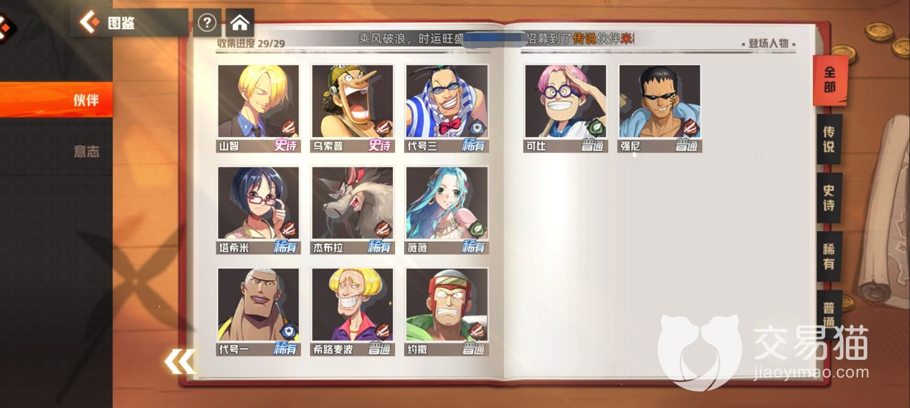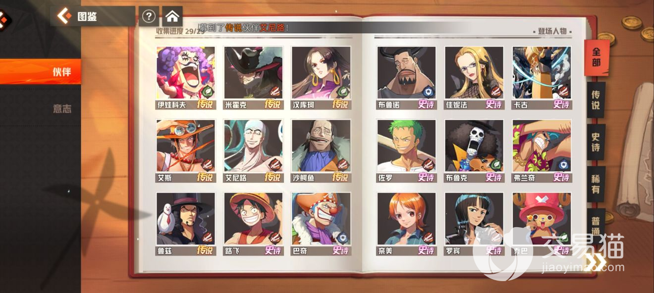 2、史诗品质:路飞、巴奇、布鲁诺、佳妮法、卡古、佐罗、布鲁克、弗兰奇、奈美、罗宾、乔巴、山治、乌索普。