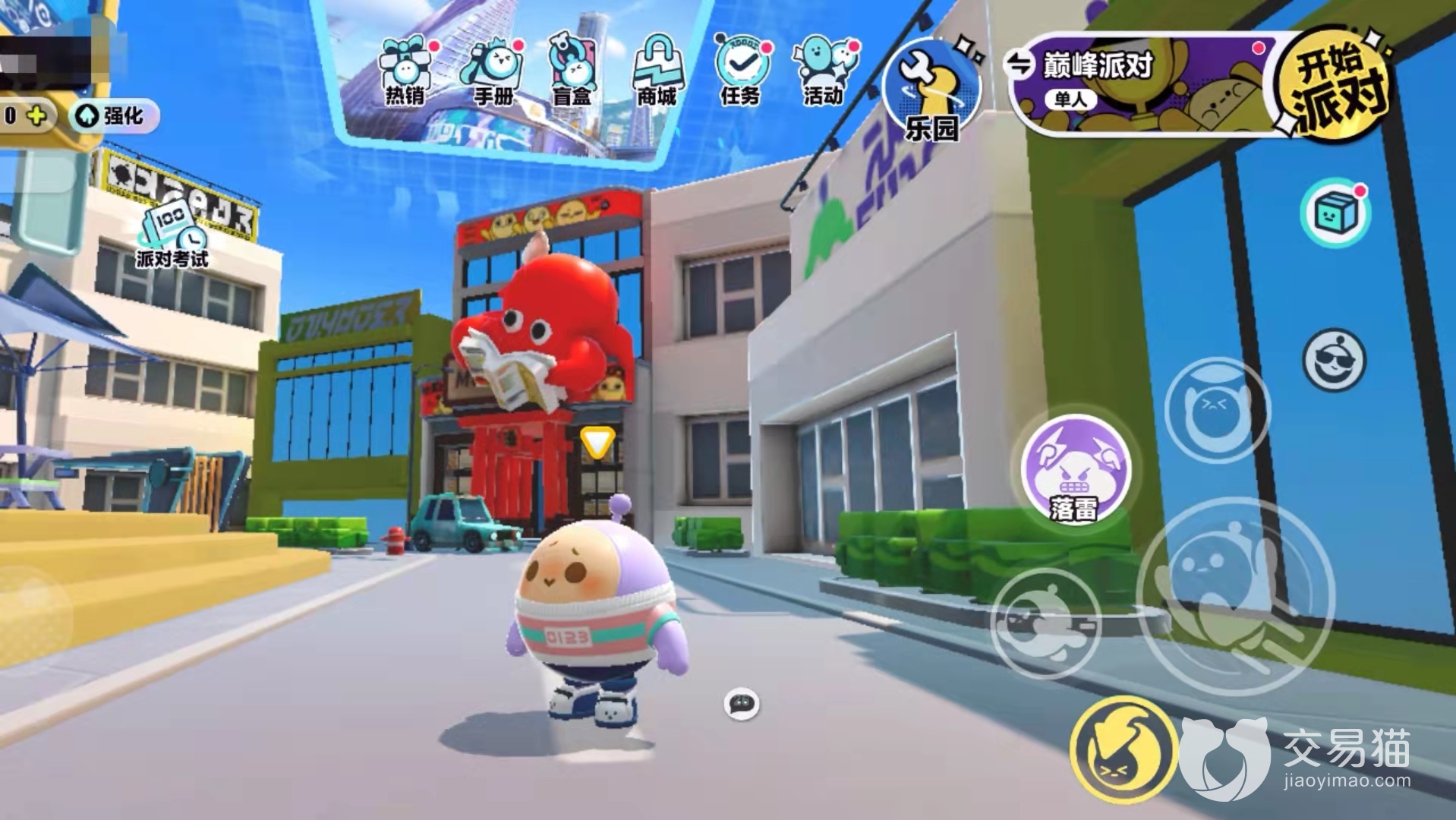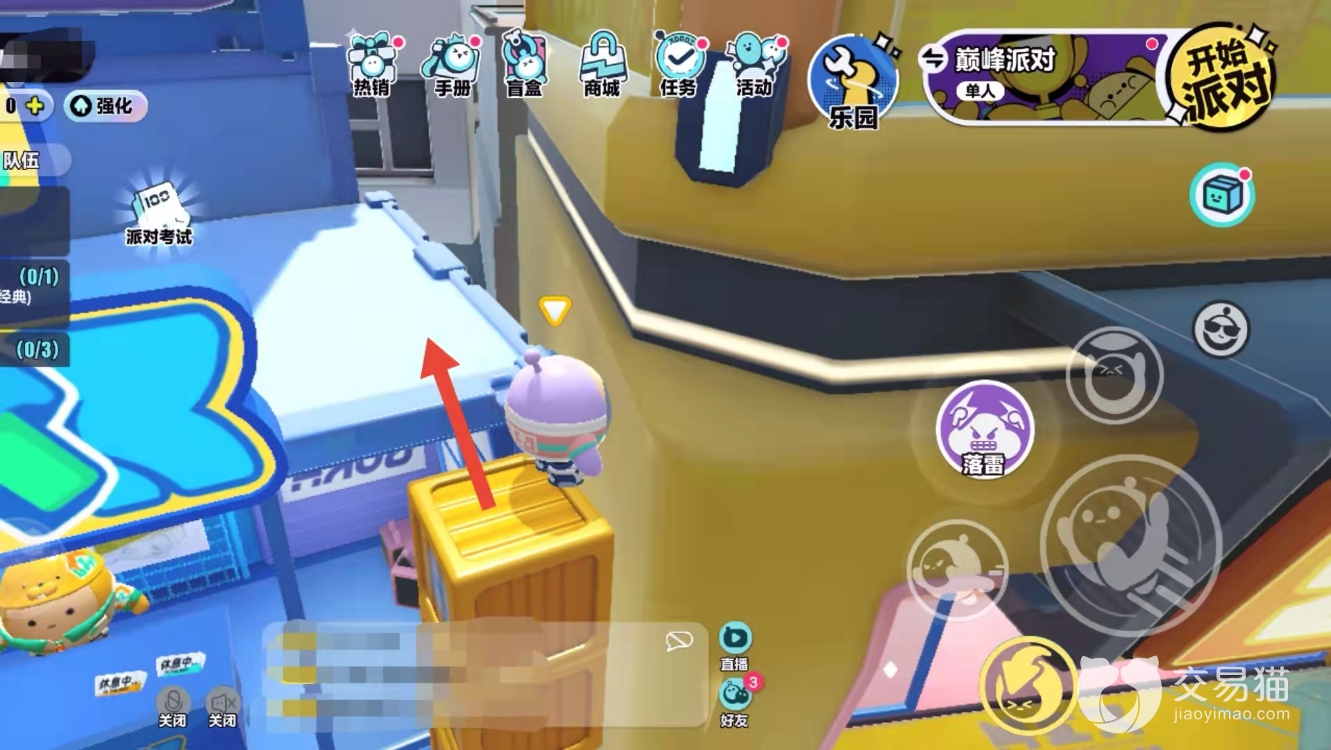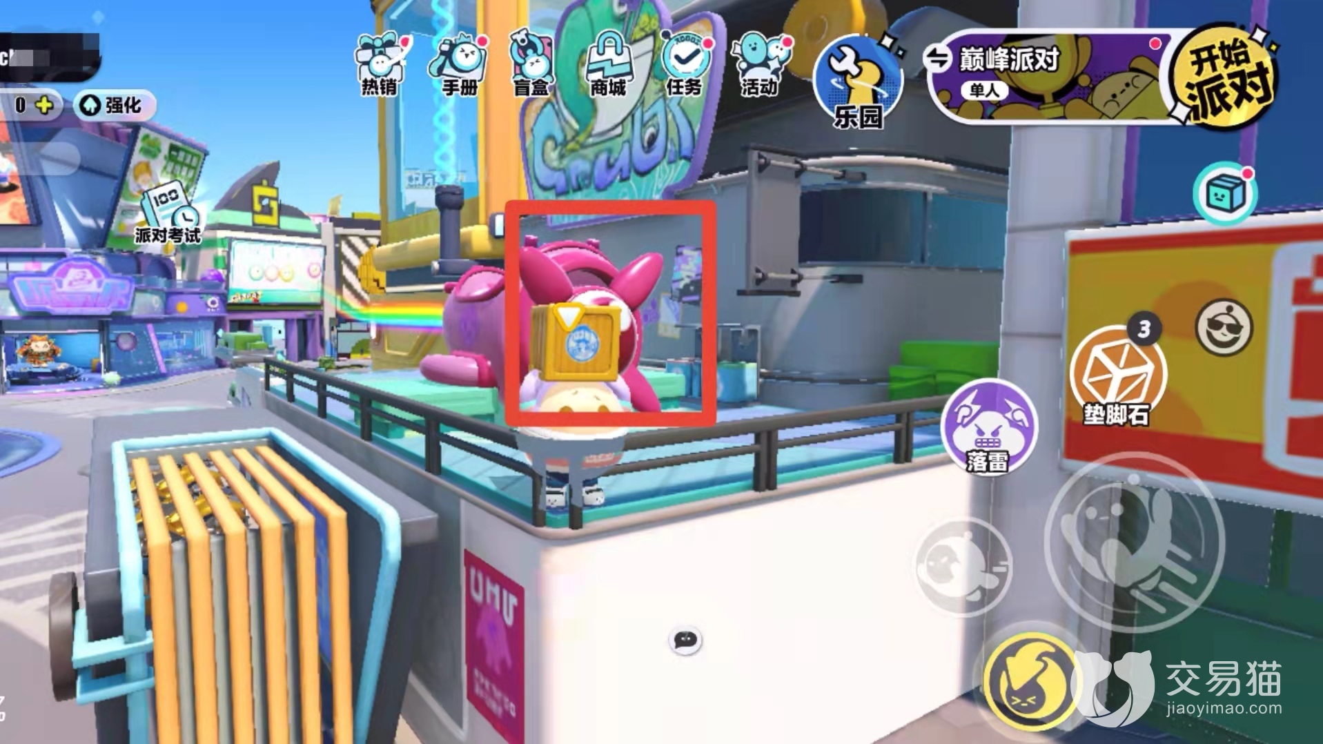首先我们要拿到踮脚箱道具,如果暂时找不到也没关系,四处找一找道具刷新,很容易就能拿到。拿到道具后,来到盲盒商店与旁边蓝色商店的角落,一块一块垒起来,之后跳到蓝色商店的顶部平台,从平台上跳到房子后方,从这里开始,后面就全都是未开发区域了。