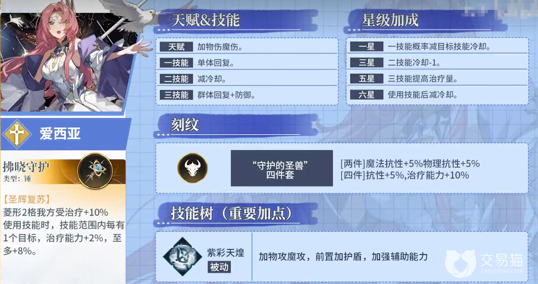 相比前两个祭司角色,爱西亚胜在保护能力,可以对队友加盾,可以提升整体阵容的坦度。虽然也是加双攻和单体回复的辅助技能,但爱西亚的技能冷却非常短,频繁的技能释放给予队友的帮助很大。