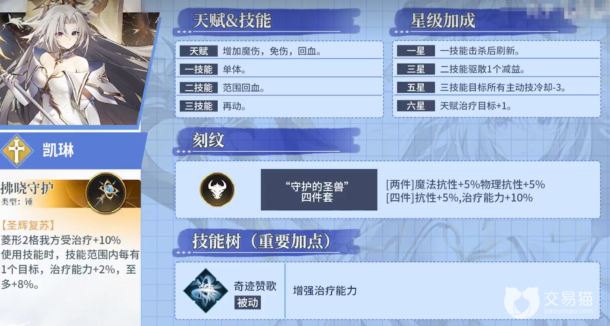 但其治疗能力一般,只能为单个角色加血,刻纹选择和凯琳一样的守护的神兽四件套,抽到就可以用。