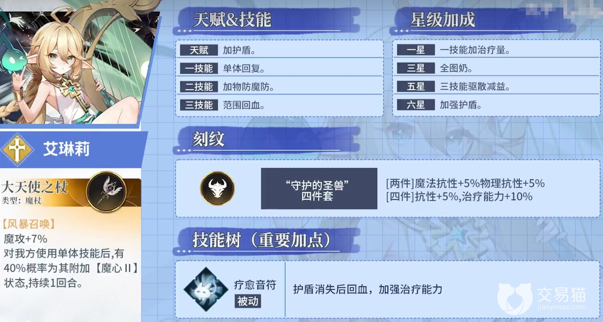 适合于玩家前期使用的奶妈角色,艾琳莉的奶量非常大,单体回复和全体回复兼具,培养后可解锁全图回复的效果。能加护盾还能加双抗,技能树在队友护盾小时候为其加血,保护强度可见一斑。