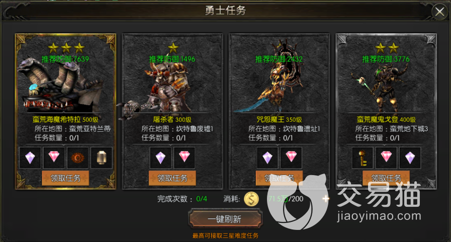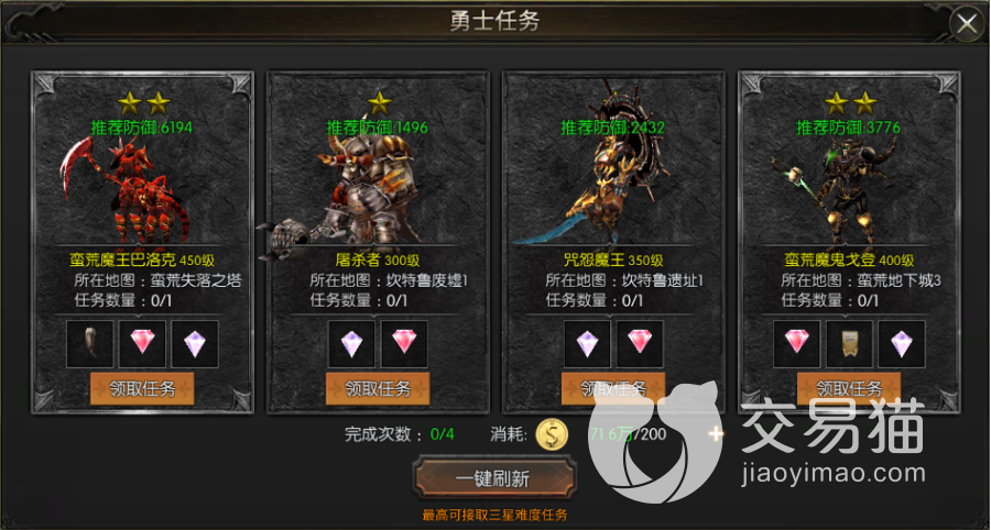 一般进入勇士任务中你可以看见本日的四个随机任务,一般的情况下是让大家去野外杀怪,怪物的等级根据任务的星级而变化,如果你游戏汇中完成了四项任务可以获得其中材料,最好的奖励是生命宝石也有几率获得。