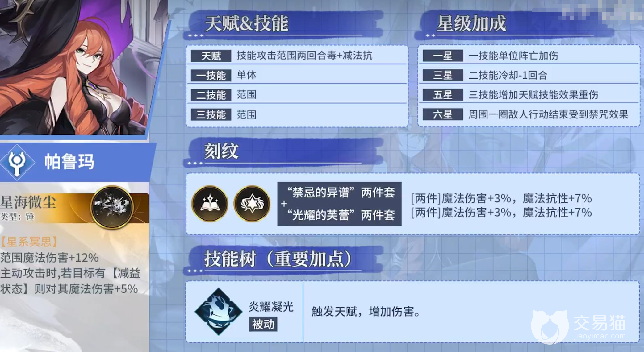 帕鲁姆则是以群体魔伤登上T0的咒术角色,伤害不低的同时还能对目标附加禁咒和重伤的状态。首先禁咒可以限制对手使用技能,没有技能的对手和挂机有什么区别呢?当前版本任何阵容都会携带奶妈,而重伤可以大大降低奶妈的治疗能力,战斗中其特效收益可见一斑。