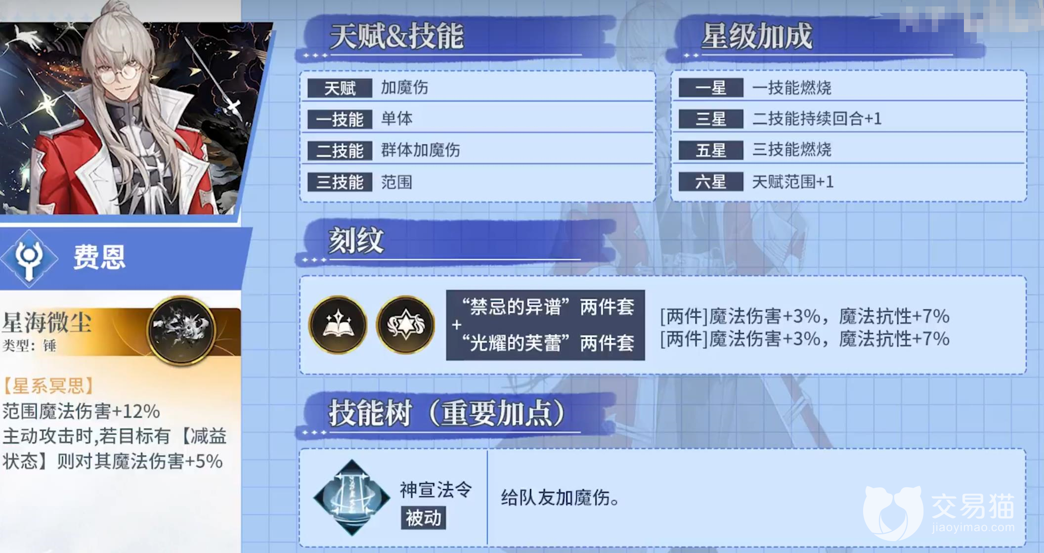 前期阵容的核心咒术角色,可作为帕鲁姆的替代品。被动自带群伤加成和对减益目标的伤害加成,自己能给目标挂重伤,或者配合上一些带有减益技能的角色非常强势。