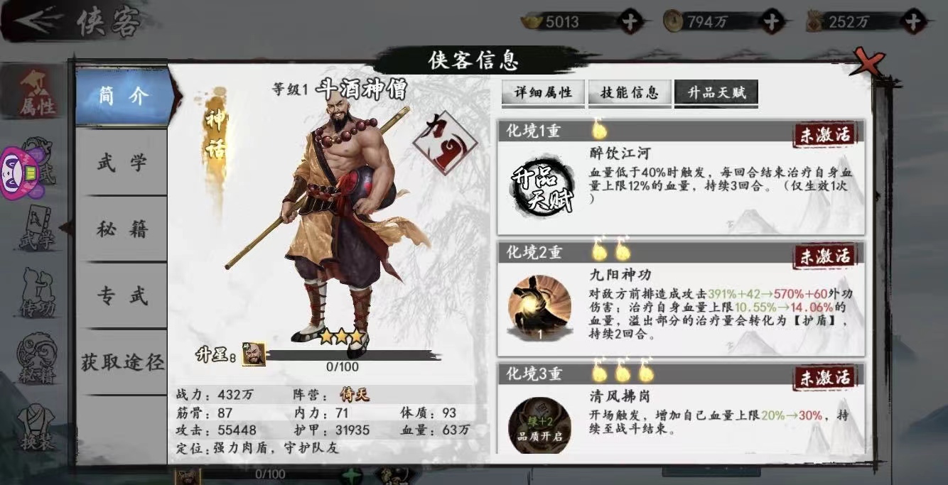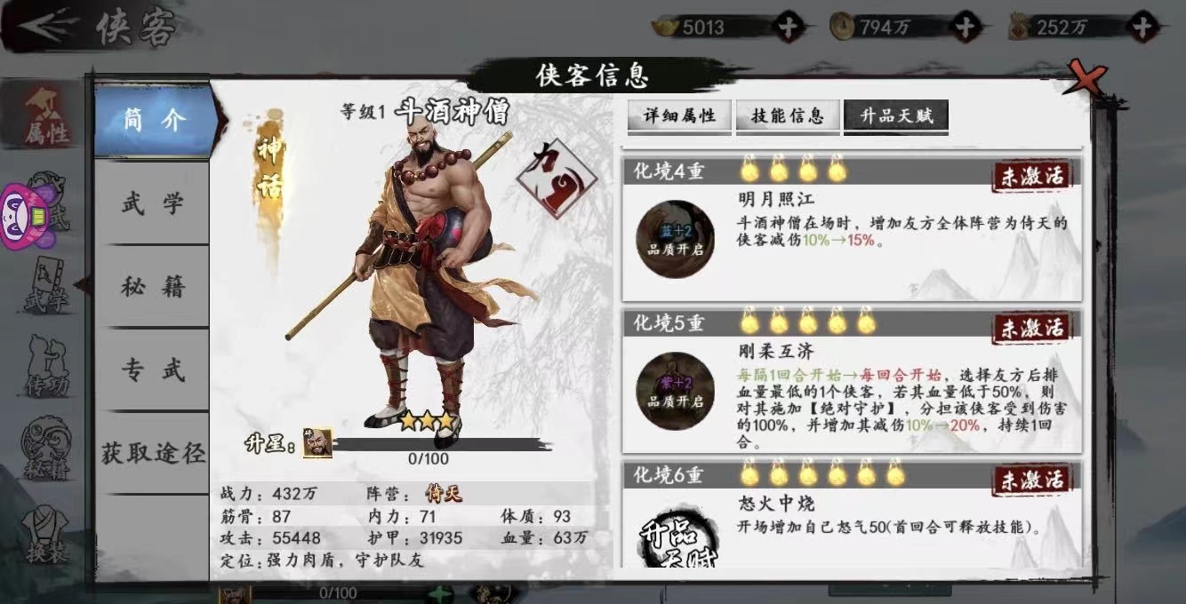 总之现阶段斗酒强度上看来,放在前排当抗伤的工具人无疑是最好的选择,是不比一灯大师差多少的,技能效果也都是一流的,至于获得途经酒馆招募即可,感兴趣的玩家可以预选招募一波。