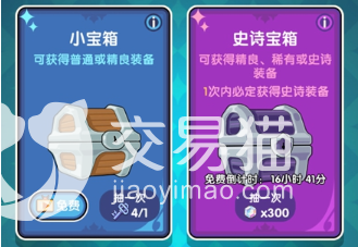 所有的宝箱都是大家通过商店来获取的,其中就包括了大家很好奇的史诗级别宝箱,这些宝箱的主要来源需要大家消耗一定的材料次啊可以抽取,其中的小宝箱可以通过钥匙来抽取,并且每天都可以免费抽取一次,开出来的装备一般都是白、绿品级的。