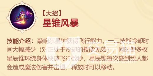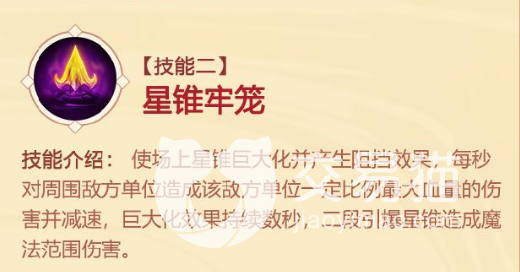 使场面上的星锥巨大化,包括地面上的星辰锥并产生阻挡的效果,每秒还会对周围的敌方造成最大比例的血量伤害和减速,只能持续数几秒,二段后可以引爆星辰锥,再次造成魔法范围伤害。