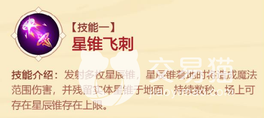 发射多枚星辰锥,发射轨迹是由斜角的幅度来朝地面射出,造成魔法范围伤害,并残留在地面上,持续数秒,但星辰锥也有存在的上限。