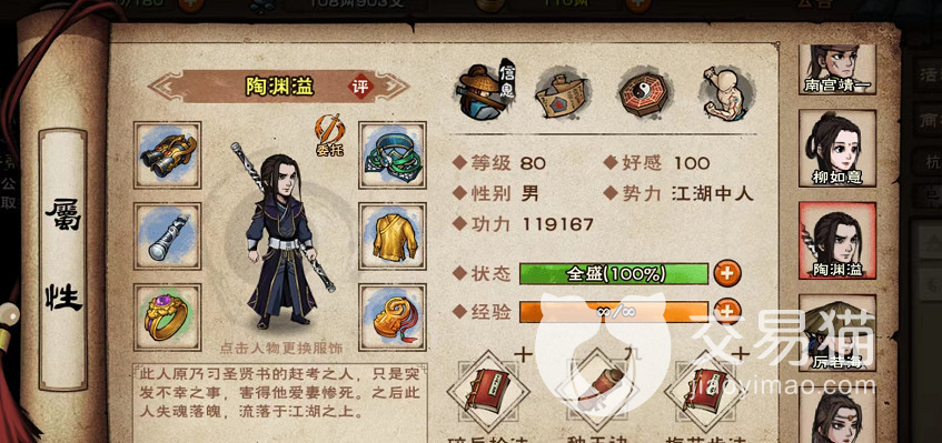 以上就是“烟雨江湖陶渊溢”怎么加点的所有攻略内容了,想能帮到大家,如果喜欢我们的文章,就请大家多多关注我们的交易猫平台,里面还有更多有趣的文章等着您来查阅哟。咱们就下篇再见。