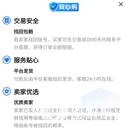 卖家在上架商品之前都需要进行严格的实名认证,以保证买家交易后的权益,平台还特别贴心地推出了“安心购”服务,用户无需付钱也可免费享受找回包赔的保险,在账号交易的过程中还可以本人上号检验。