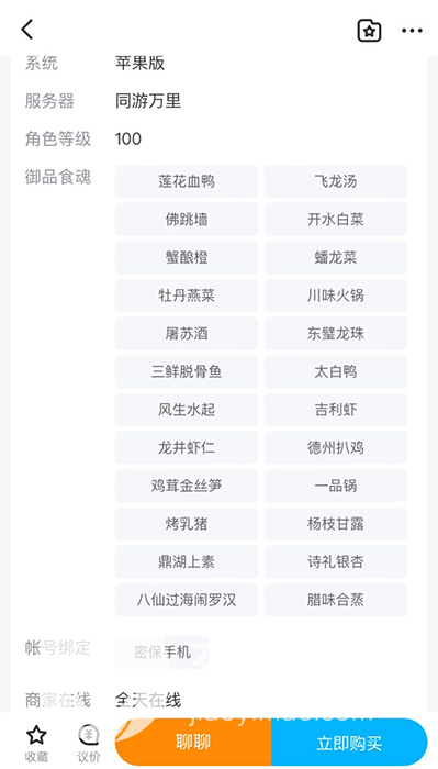 在商品详情页面中,买家能够了解账号类型、服务器、角色等级、食魂数量、账号绑定安全信息、好友数量、商家在线时间等。