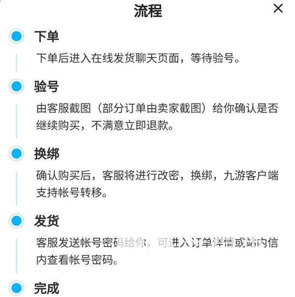 目前平台的购买流程分为五步,其中除了下单是由买家自己手动开始的之外,剩余的四个步骤都是支持自动完成的,速度比较快、效率很高,而且由于平台的全程介入,所以也十分安全。验号、换绑和发货都可以通过官方来完成,而且都是自动进行的,帮助大家规避掉一些风险,也会卖家减轻了不小的压力。得益于平台的强大实力和优质的服务,给用户们带来了非常棒的购物体验。