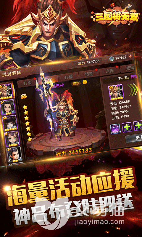 吕布是目前版本中输出核心的佼佼者,拥有很高的物理面板,对于防御低的阵容可以直接一套带走,更是攻打高难度副本的好手,就是对于阵容的要求还是蛮高的,必须搭配一个可以减少敌方防御的角色,还要再加一个免控的前排,保护吕布。