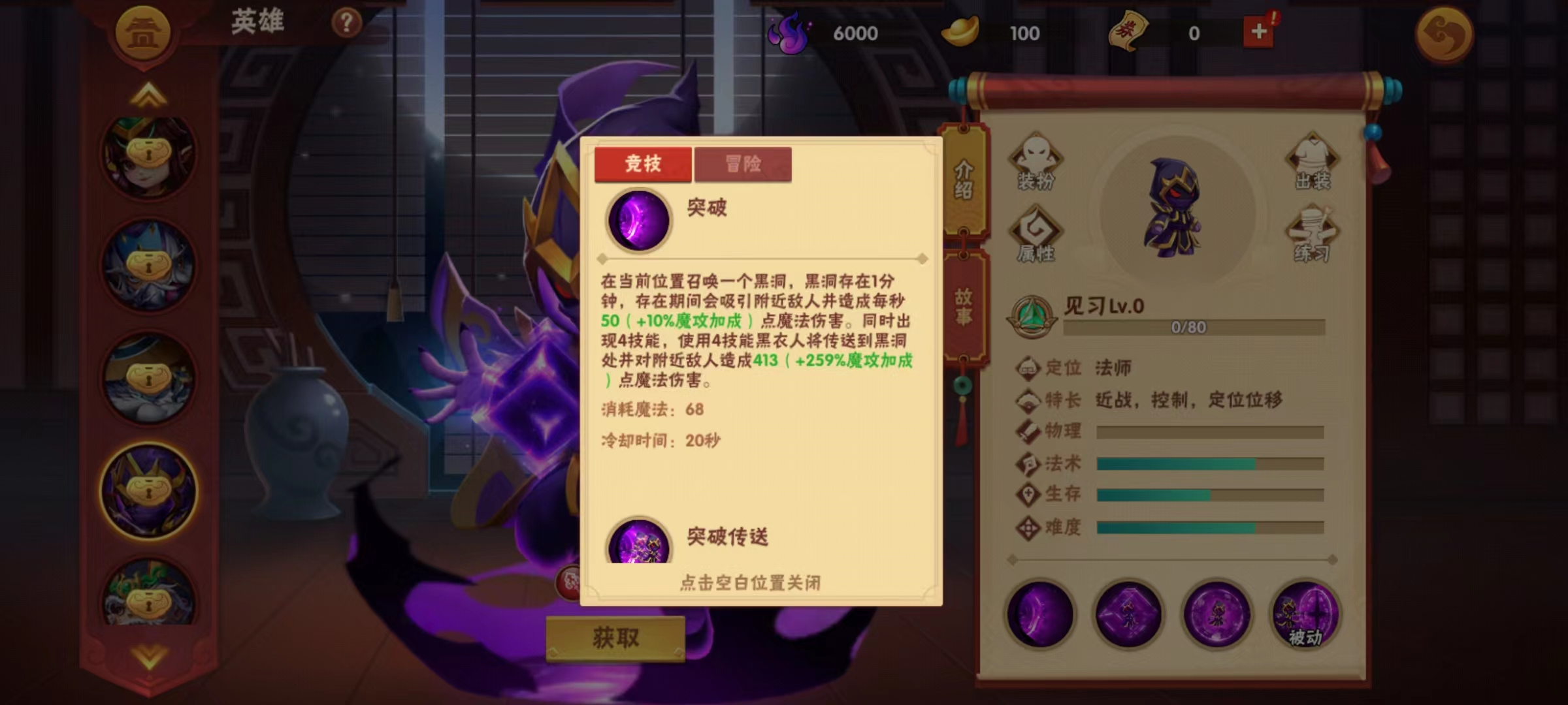 一技能突破,可以在自身当前所处位置召唤一个黑洞,黑洞能够存在一分钟的时间,在此期间内会不断吸引附近的敌人并且造成伤害,使用之后黑衣人获得第4个技能。第4个技能的效果是能够使黑衣人传送到黑洞的位置,并且对附近造成一次魔法伤害,传送并非立即进行,而是需要两秒钟的延迟时间。但这并不影响这一技能成为真正的神技,也是最考验操作的地方,黑洞留存的位置、传送的时机,都将影响黑衣人的输出。最常见的套路就是在隐蔽的位置留一个黑洞,然后快速传送过去切对方的后排或落单的英雄,以及用于抓人都是非常合适的。
