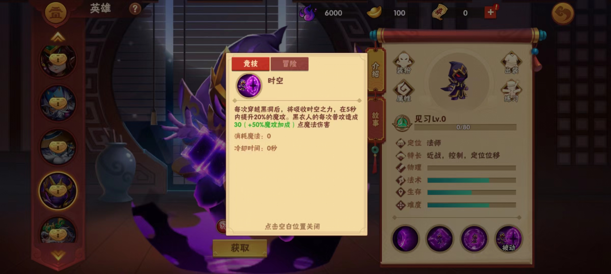 首先来看一下对黑衣人的定位,虽然是法师但是擅长近战,拥有一定的控制效果,而且可以进行位移,这些都是极其考验操作的地方,相信在场上会出现很多秀的飞起的黑衣人,当然前提是要先熟悉技能。被动技能时空,使得黑衣人可以在每次穿越黑洞后都能吸取时空之力,接下来的5秒钟之内提升自身的魔法攻击力,同时每次普攻还有额外魔法伤害加成,所以这一个角色比较依赖于普攻,最起码要在技能间隙穿插大量普攻。