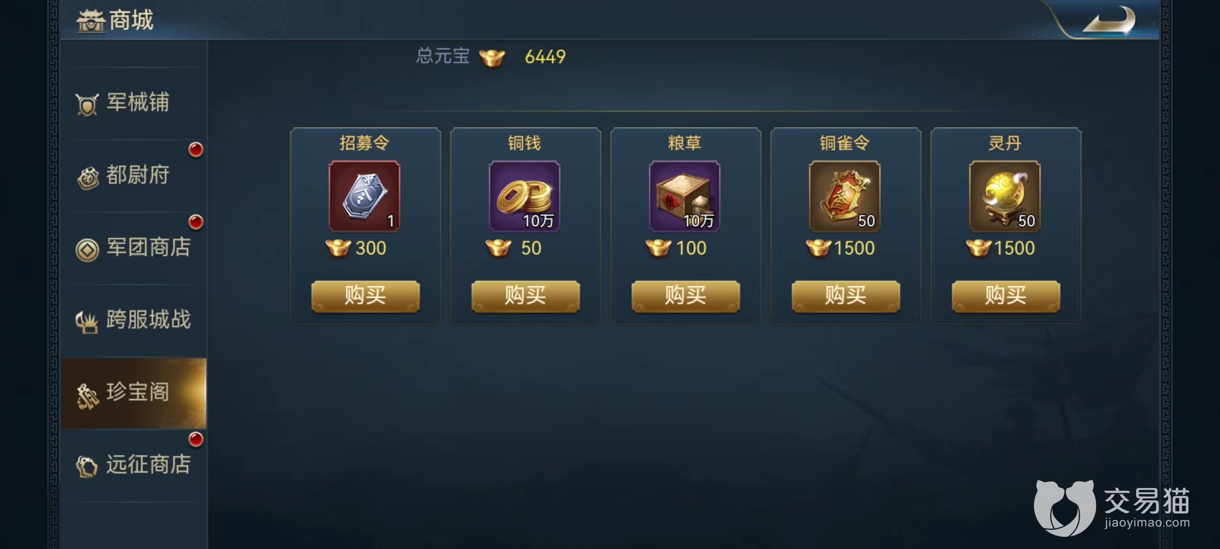 最后是在集市中能够购买到铜钱,需要花费元宝,但是日常并不推荐大家这样选择,因为元宝还有更多的用处,如果是急需铜钱可以用于救急。此外在军团商店中也能够消耗贡献来兑换。