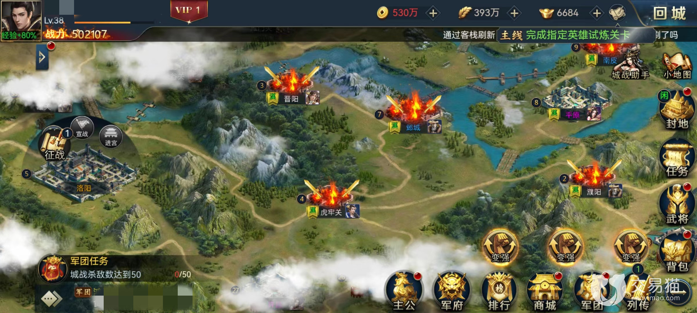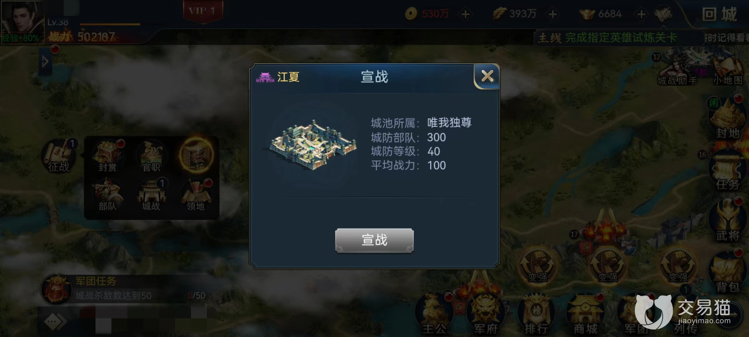 城市按照大小分为关隘、县城和都城,其中前两个可以直接攻打,后面需要宣战。进入到城战中时可以直接派兵开始战斗,无论击杀对面的玩家或是NPC士兵都将获得杀敌积分,最终根据积分来发放奖励。通过逐渐占领城池,往中间洛阳进发,然后点击宣战,只要攻占了洛阳城,则本次争霸战获得胜利。沿途需要不断战斗,因为不相邻的城池无法直接占领,也就是要一路平铺过去。