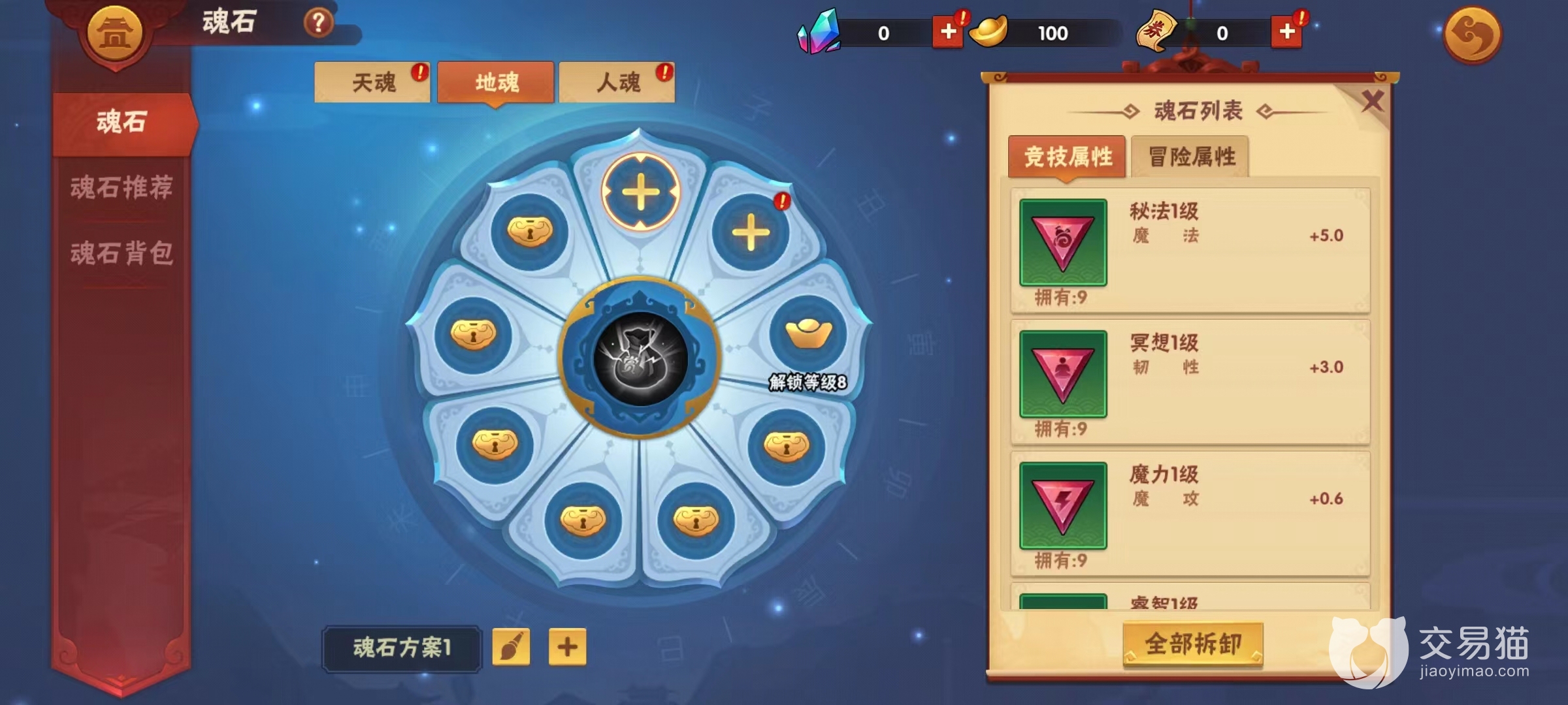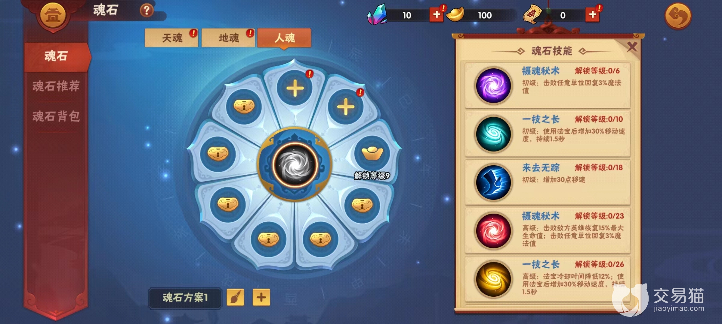 魂石分为天地人三大类,每类魂石又分为9种且最多镶嵌9颗。但初始玩家只拥有一个魂石槽,只能镶嵌一颗魂石,随着玩家等级的提升,可以花费元宝解锁更多的魂石槽。