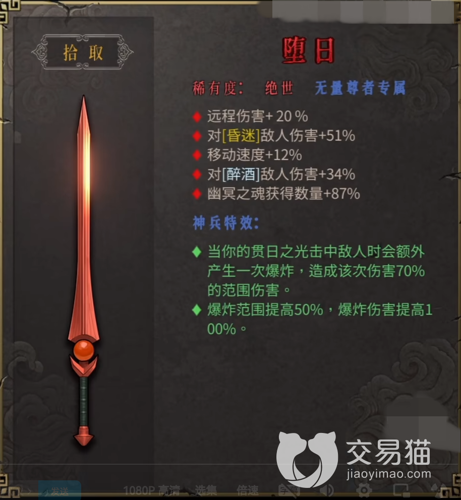 首先是武器的选取太祖是神器但是这个流派还是推荐使用堕日这把专属武器,贯日流派最需要的就是伤害了,玩家要在放收剑效果结束之前将前方的怪物清楚完成不然依靠放剑的伤害是异常的刮痧的,堕日的效果不但能增伤还能增加攻击范围,在高难度怪物扎堆的时候没有这个效果很多时候连小怪都打不过。