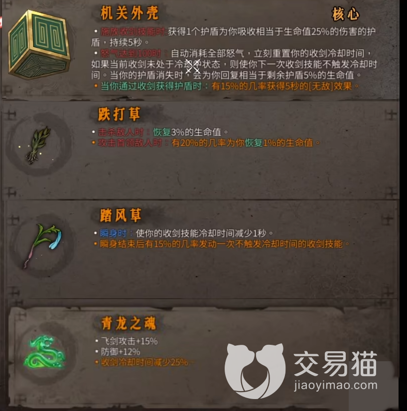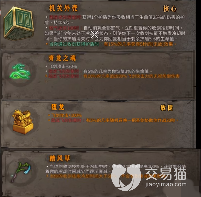然后是是装备的选取了,因为极度依赖收剑的效果所以需要各种的减cd那么机关外壳就是妥妥的核心了,它的收集怒气重置cd的效果无可替代,要想玩这个流派不断激光,玩家需要首先找到这个装备,不过玩家点了天赋之后可以开局选择一个圣物所以玩家一定是能凑到这一件装备的。之后其他的位置就是传统的续航以及以及增伤的部件了,例如憎恶、青龙、堕龙、踏风草这些都是基本上见到必带的了。