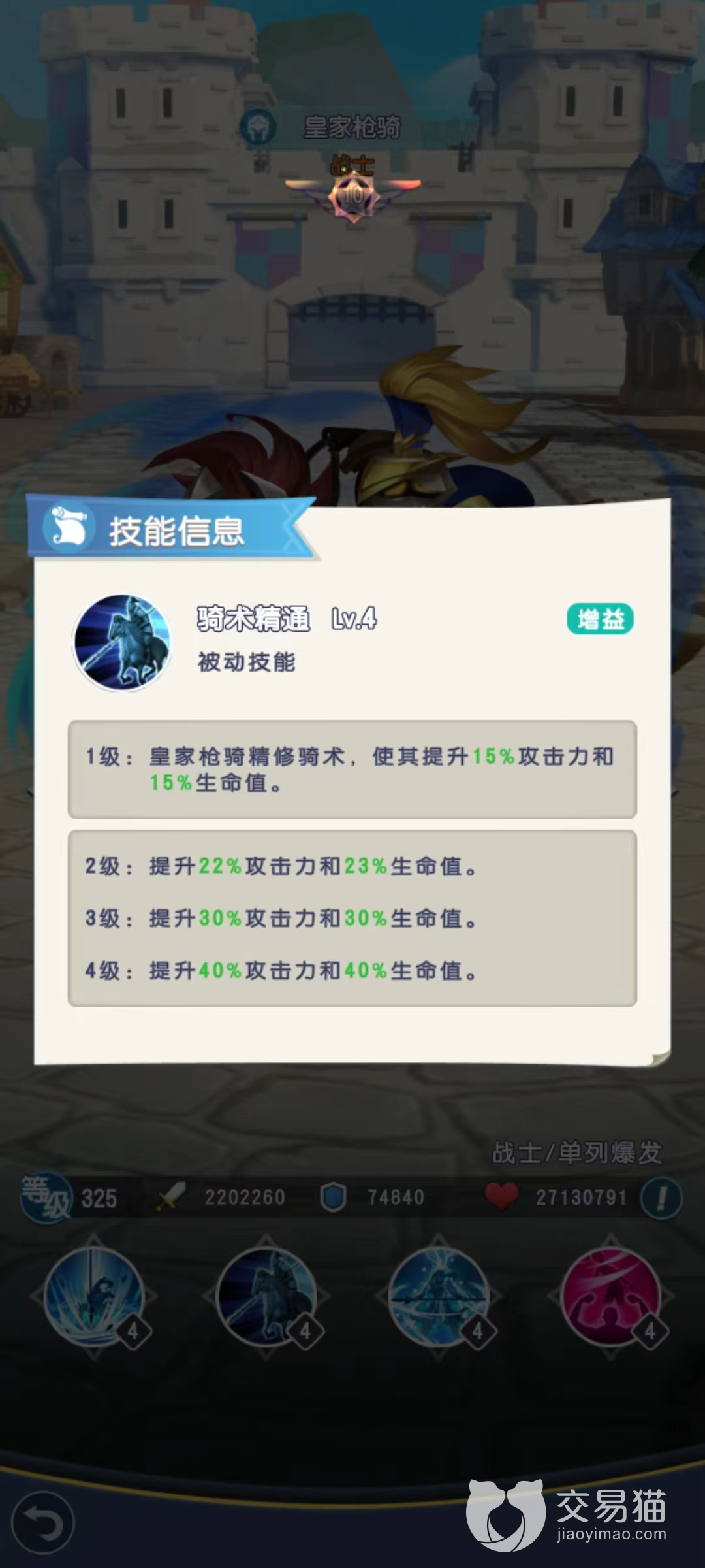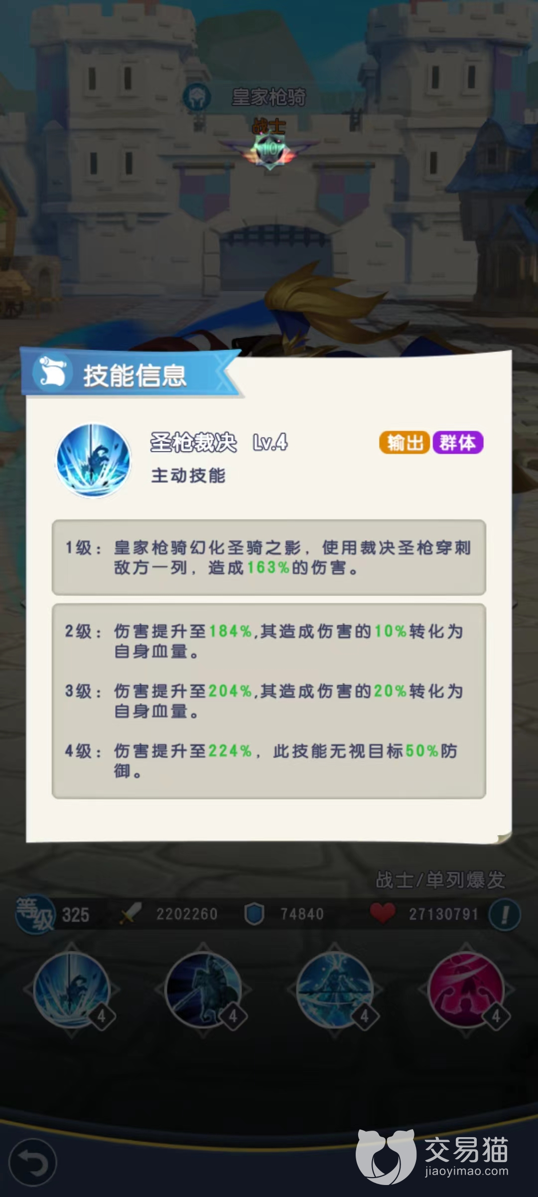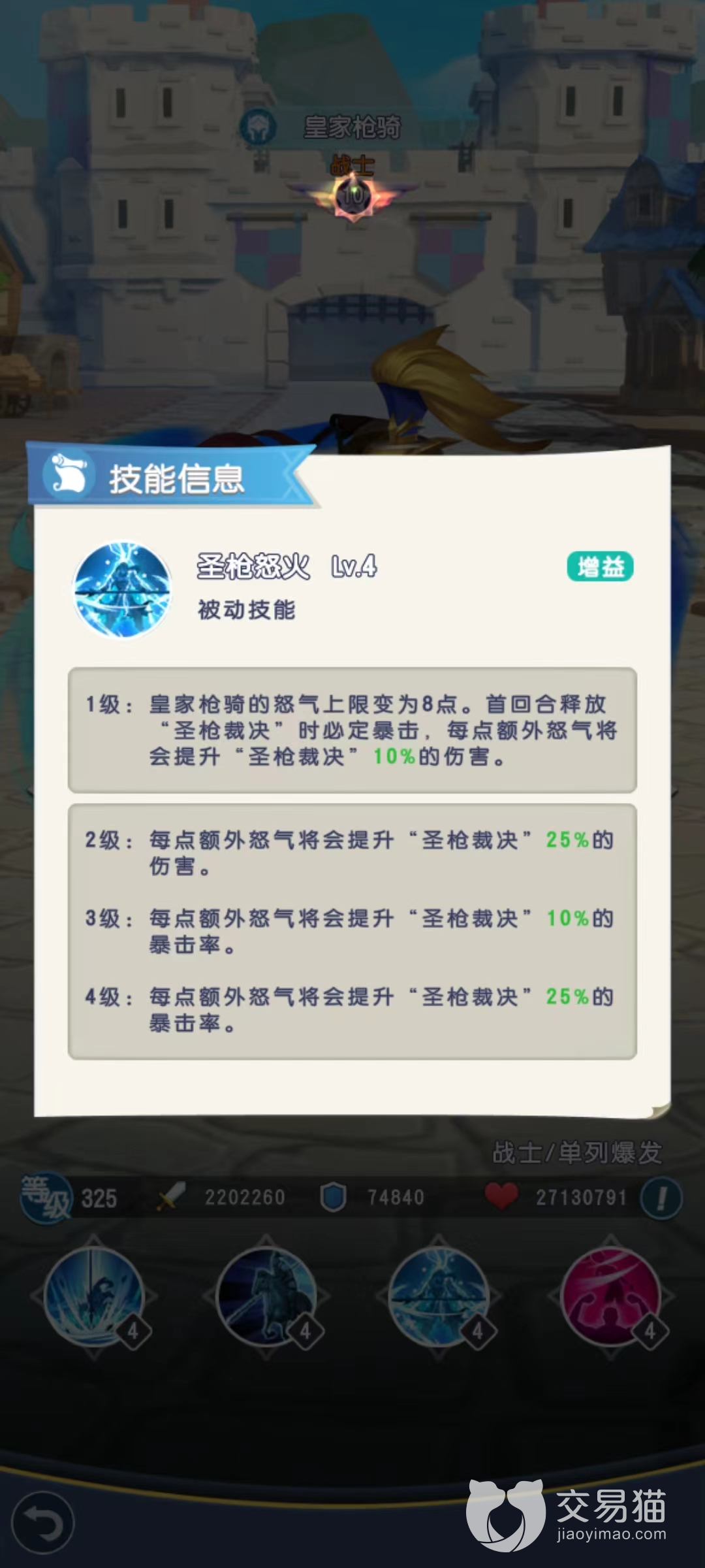 并且在被动技能加持下攻击力和生命值能够得到很高的提升,另一个被动圣枪怒火,使得怒气上限提高,并且在第1次释放大招的时候一定出现暴击效果,使用技能时额外获得的怒气值将会提高技能伤害。