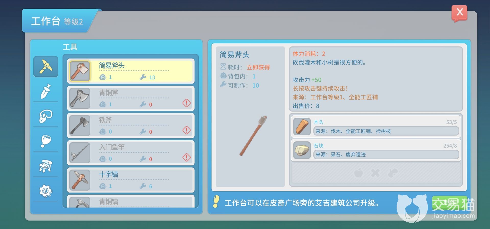 制作灌溉器需要三级的工作台才能做出,如果发现自己的工作台没有灌溉器的图纸,大部分是因为工作台的等级低,小编这里就是因为等级低而显示不出来灌溉器的图纸,大家可以去艾吉建筑公司升级自己的工作台到达一定等级就有灌溉器的图纸了,材料凑齐就能做出灌溉器了。