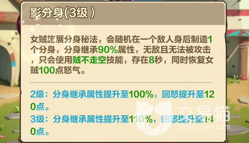 三技能为影分身,可以使用该技能快速的将自己制造出来两个,分身不会受到攻击,而且技能是可以复制的,这也让玩家拥有两段技能,存在时间为15秒,还能为玩家恢复一定的怒气值,女贼可以利用这个技能快速进行输出。最后他的大招名字非常有趣,叫做趁你病要你命,这也是一个非常有趣的网络段子,场上出现低于40%血量的敌人,可以快速触发女贼的攻击效果,他将瞬移到敌人面前,造成100%的攻击伤害,并且恢复自身一定的怒气值。