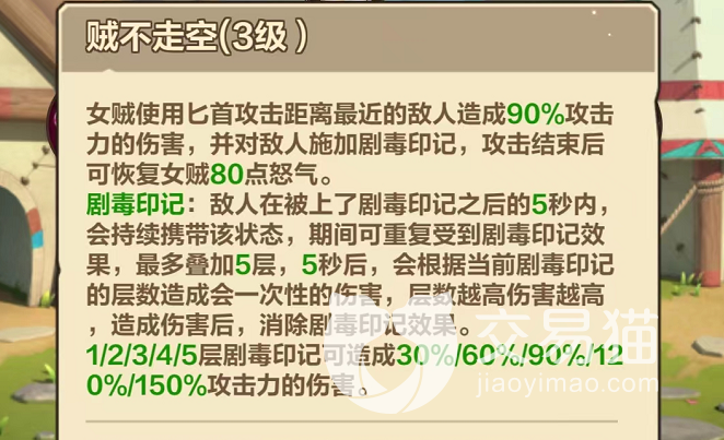 一技能的名字非常的有趣,叫做一波带走,他能给全场所有的敌人叠加一层毒印记,最多叠加五层,这个毒印记虽然在施加之后不会立马爆发,但是在五秒之后可以触发所有的印记,对对手造成多层伤害。如果实力给力的话,那么基本上可以一波带走对手了。他的第二个技能为贼不走空,这也是女贼最常用的技能了,可以用匕首去攻击离自己最近的敌人,造成100%的攻击伤害,并且玩家在攻击的时候还会有50%的概率可以对敌人施加毒效果,这个可以在后续触发印记风暴。